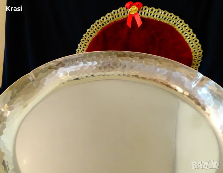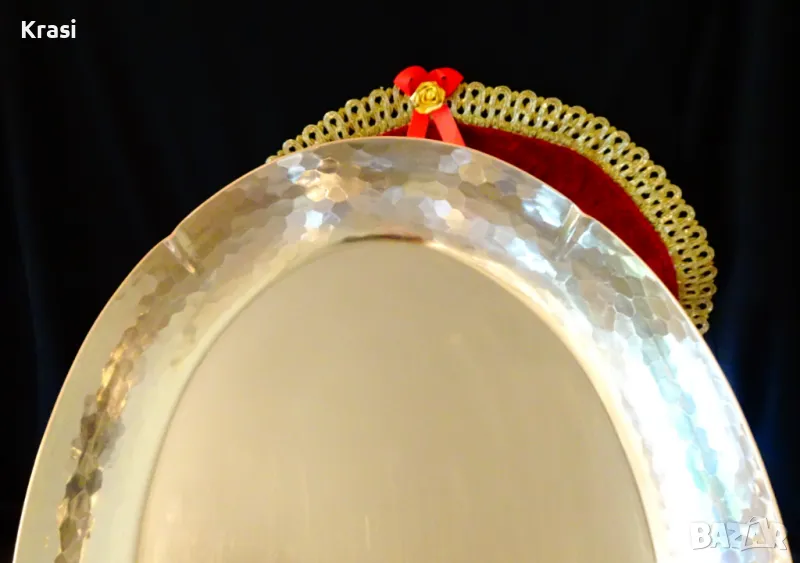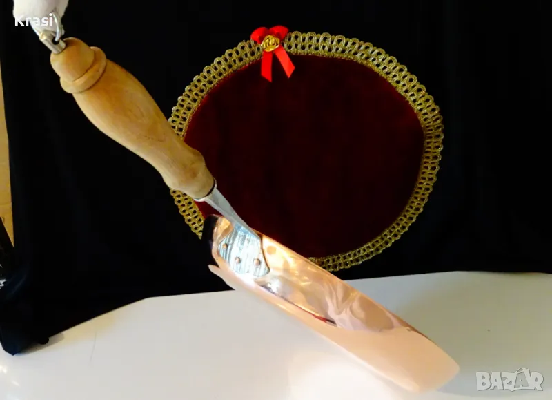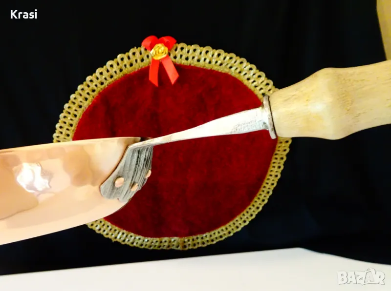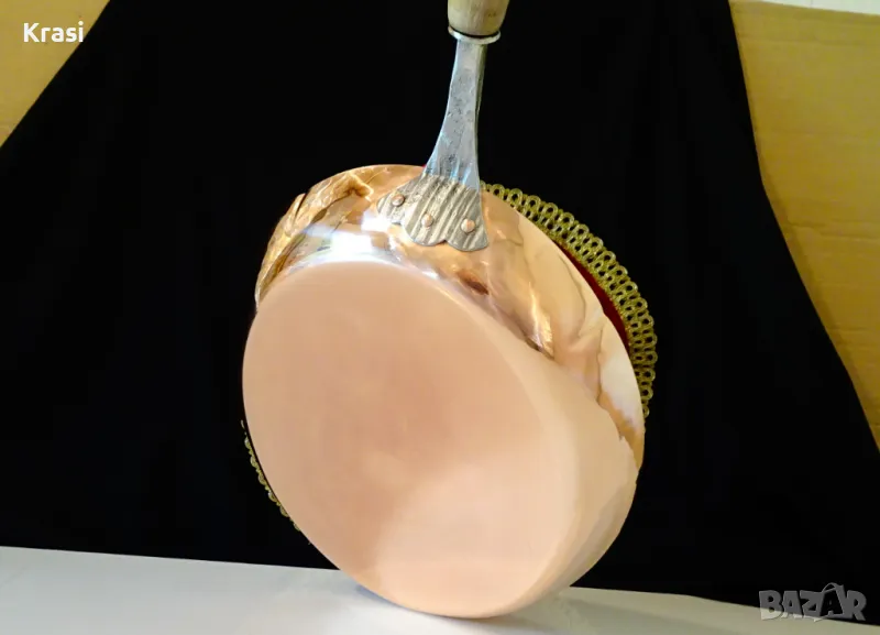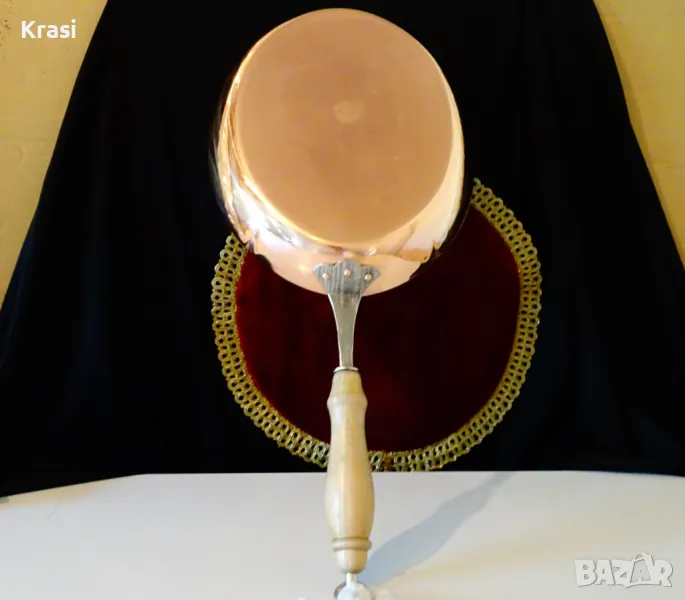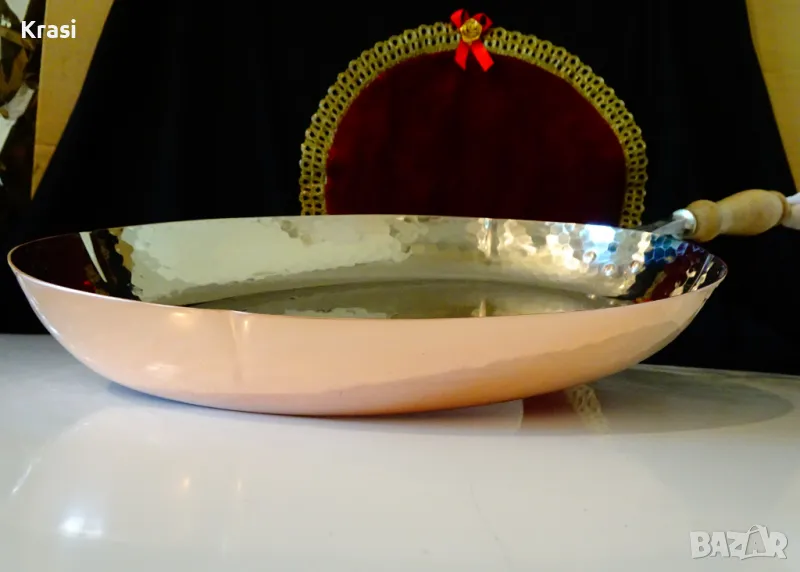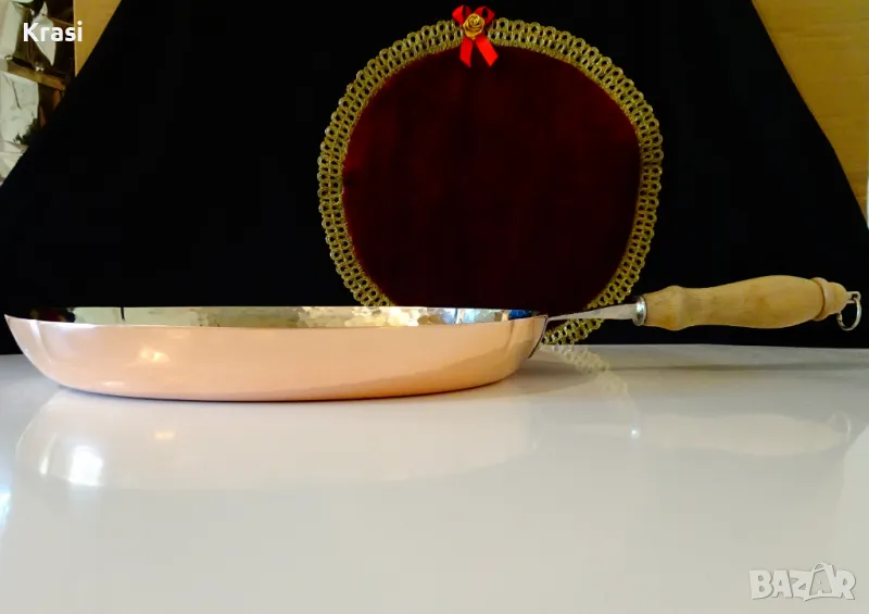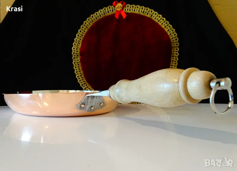 Старинен тиган с овална форма,предназначен най-вече за приготвяне на риба,свръх качествена ръчна изработка от чиста червена мед на швейцарския производител Stockli Netstal Swiss Made,маркиран.Има яка дръжка от неръждаема стомана,занитена за съда с три медни нита и ръкохватка от плътно естествено дърво.Дръжката завършва с халка за окачване.От вътрешната страна съда на тигана е галванично покрит с тънък слой блестяща неръждаема стомана,вместо калай,благодарение на което може да се ползва за пържене и съхранение на ястията.В този случай отпада необходимостта всяка година да се дава за калайдисване.Прилагам увеличена снимка на ръбчето за уверение,че става дума за меден тиган,от масивна мед,а не за тиган с медно покритие.Вечен съд за готвене и сервиране на високо ниво.Дължина 55 см.,размер на съда 32 х 24.5 х 4.5 см.Размер на дъното 28 х 20 см.Дължина на дръжката 23 см.Тегло 1 кг.