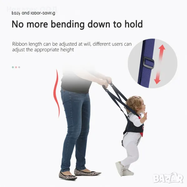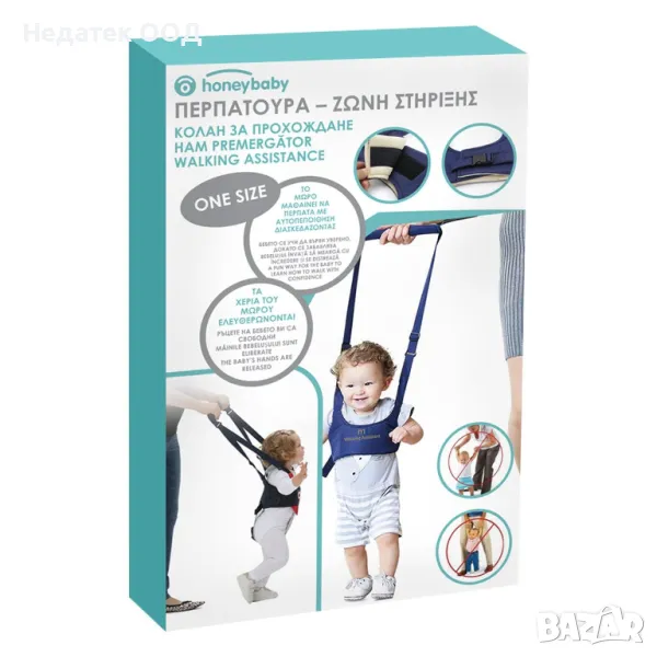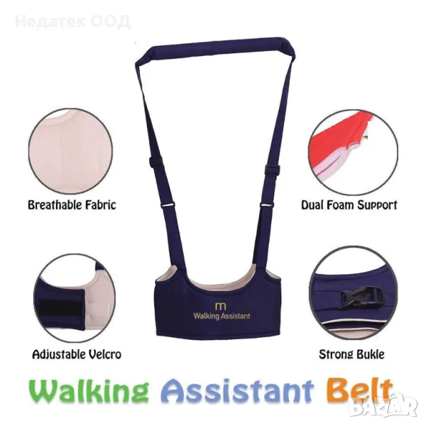 Поддържащ колан - проходилка, която помага на вашето бебе да придобие увереност и да преодолее страхове като падане, осигурявайки опора и стабилност, за да се научи да ходи самостоятелно. Закопчалката и презрамките могат да се регулират според височината и теглото на бебето, както и според дебелината на дрехите. Освен това може да се използва през всички сезони дори през лятото. Бебето няма да почувства топлина или дискомфорт. Много е полезно и за възрастните, които придружават детето, тъй като не се налага да се навеждат и да натоварват кръста си.