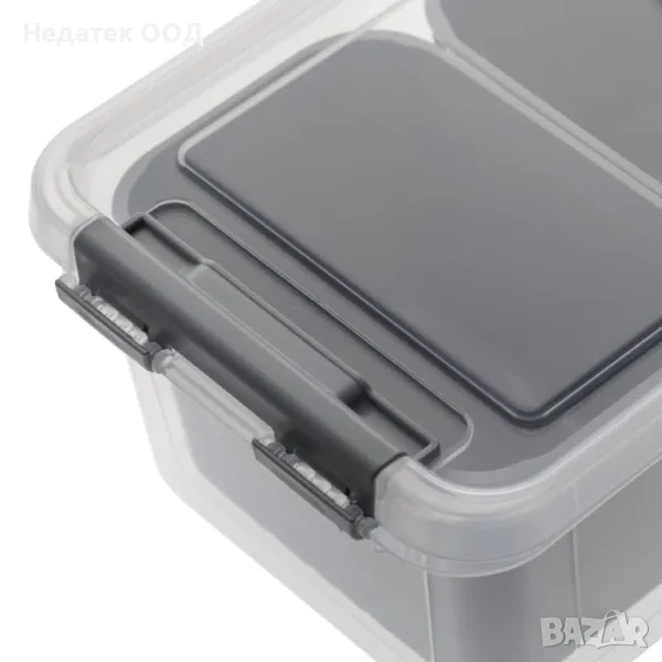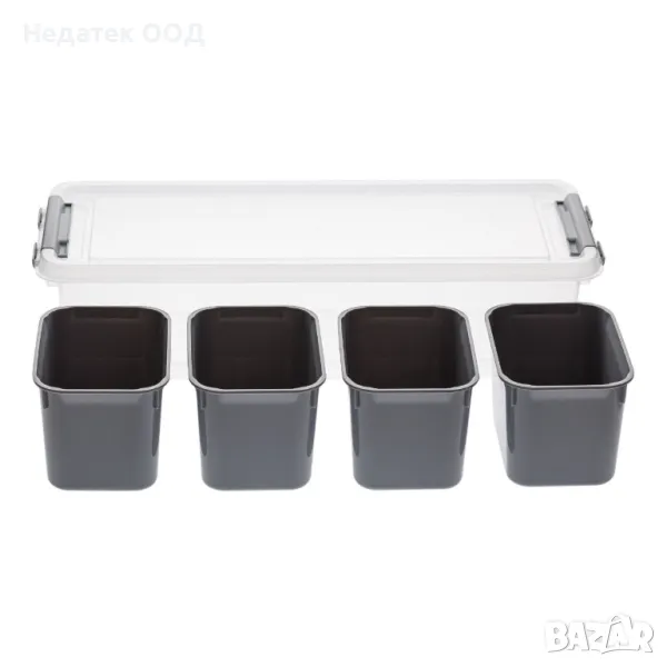 Кутия за съхранение органайзер с 4 подвижни сиви отделения и капак със затваряне. Идеален за организиране на дребни предмети и в зависимост от размера за премахване на калъфи. Всеки сив корпус е с размери 12x8x7.5 m.