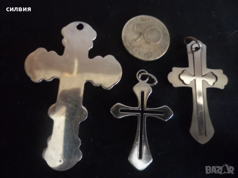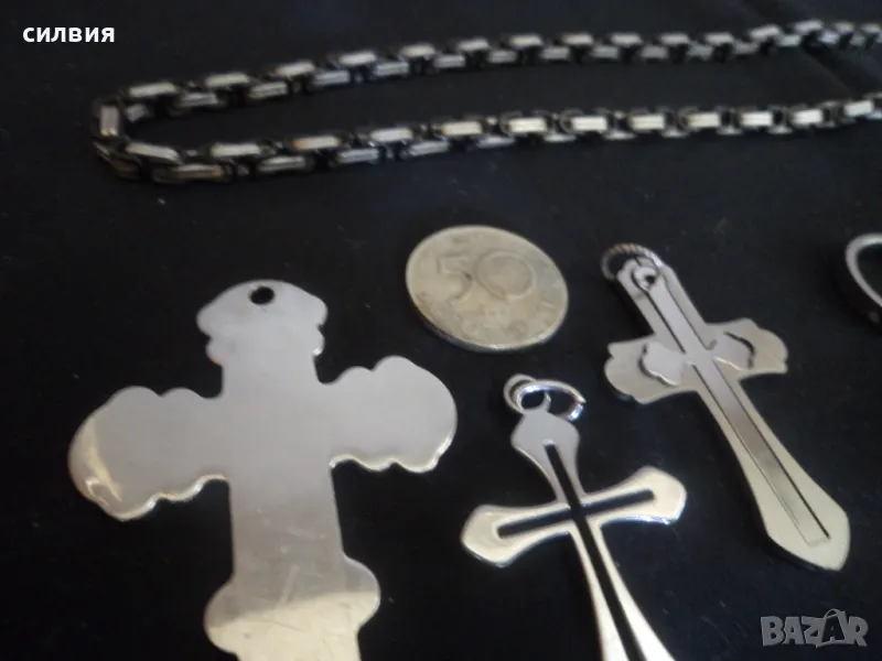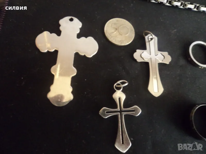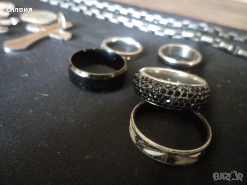 5 пръстена от стомана и други метали , 3 кръста от стомана и един стоманен ланец , цената е за целия комплект , ланеца е около 61 см. дл. останалите са с различни размери