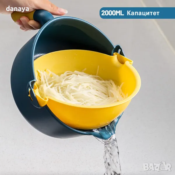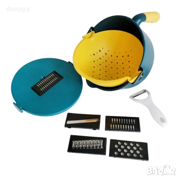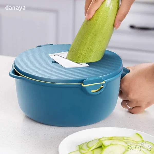 С нея режете плодове и зеленчуци като професионалисти само за няколко минути. Освен това тя е с подвижна основа и цедка. Миете, режете и сервирате салата с един уред! Купата е с удобна дръжка, с която лесно накланяте и изцеждате водата. Можете да режете на шайби, жулиени, финни парченца, да свържете и да отцеждате без проблем! Благодарение на защитната шапка ще избегнете порязвания и наранявания по време на рязане. Можете да я почиствате дори и в съдомиялна машина.