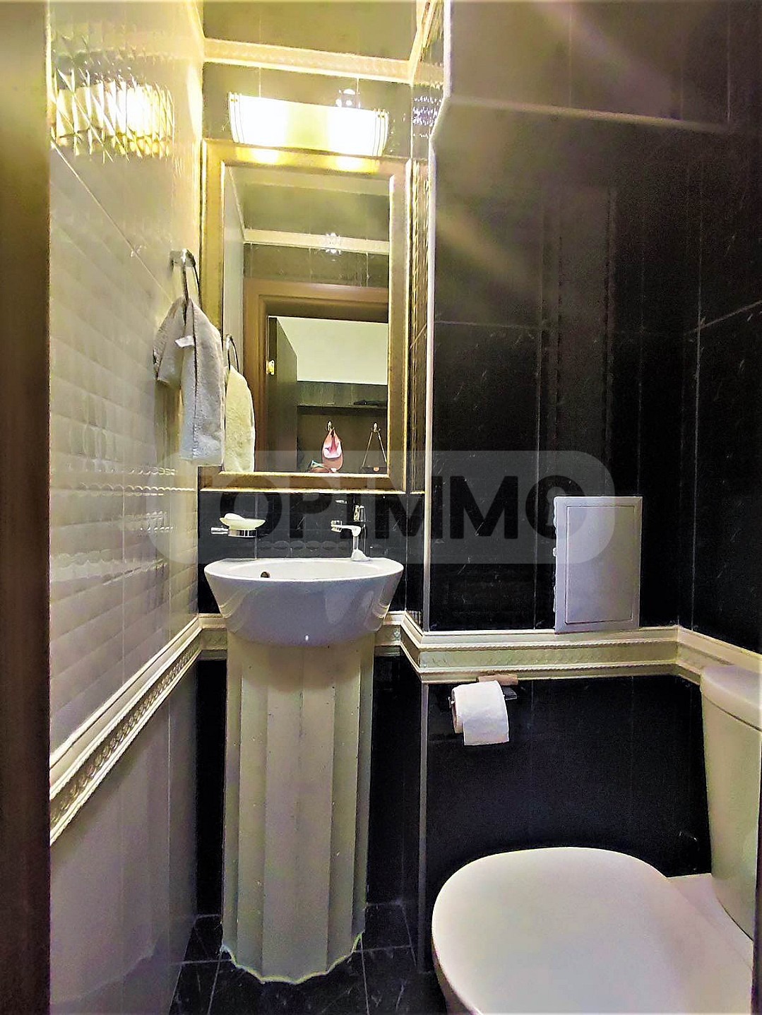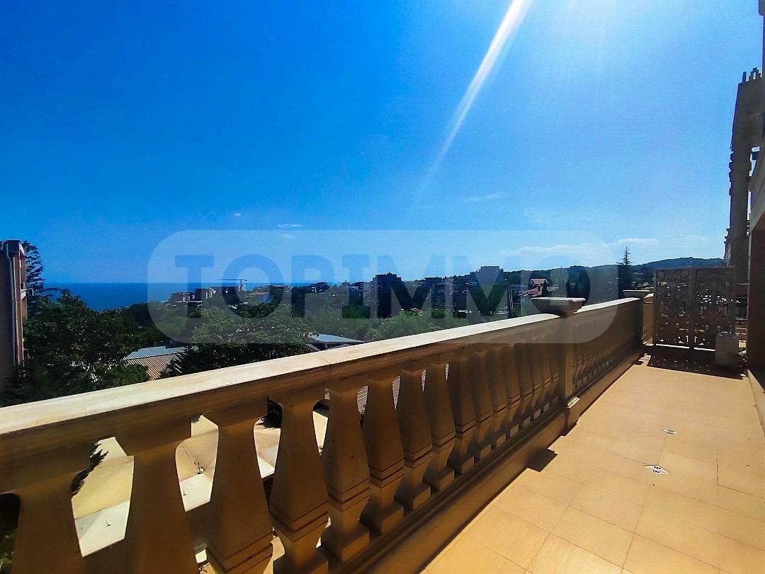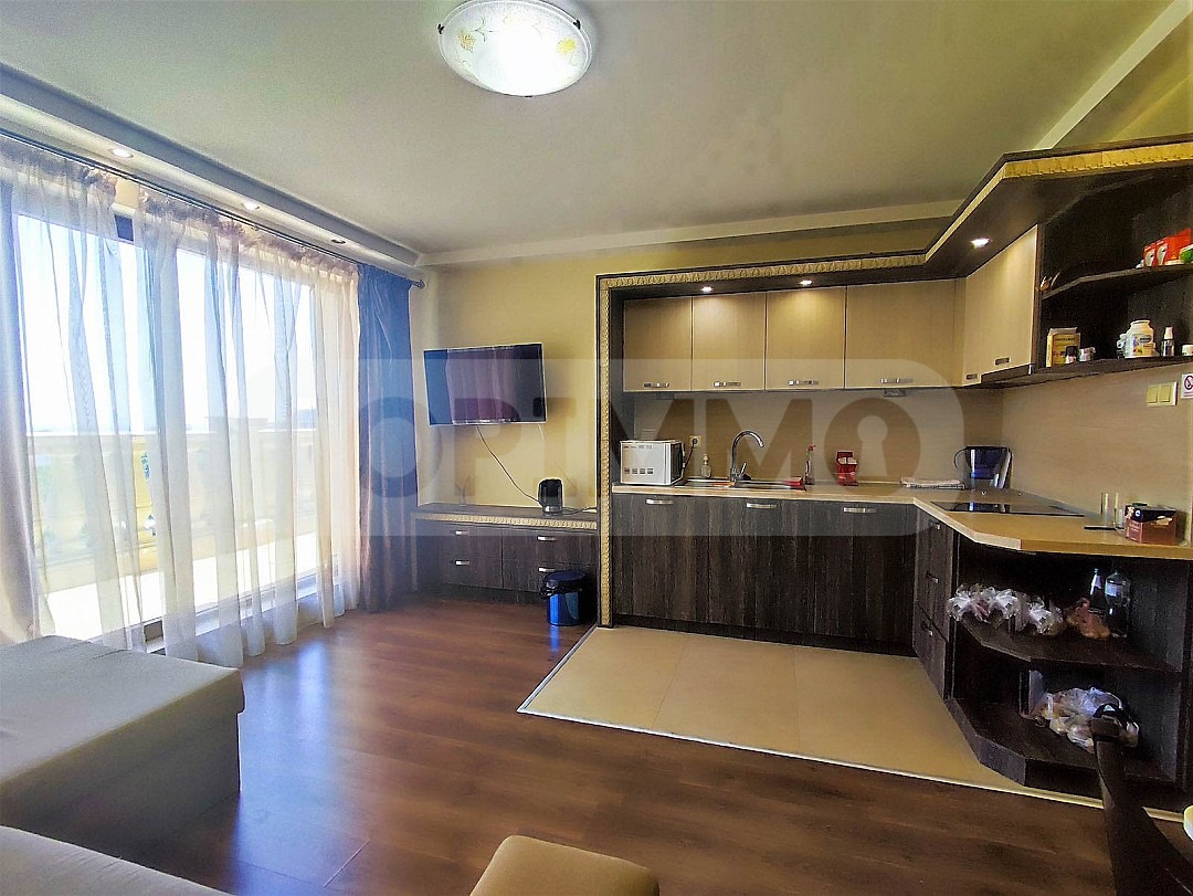 Апартаментът е разположен на пети етаж (от седеметажна сграда) и се състои от дневна с кухненска част, 2 спални, баня с тоалетна и тераса с морска панорама.