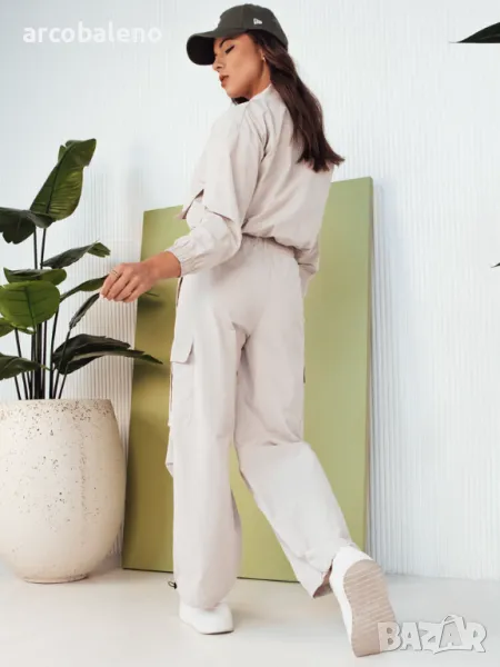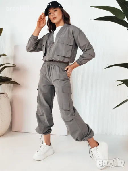 Изненадайте всички със стила си с дамския комплект ROTVE, който е синоним на градска лекота и функционалност. Бомбър яке с големи джобове и широк карго панталон са идеална комбинация за всяка жена, която цени комфорта и модерната визия. Връзките осигуряват перфектно прилягане и комфорт при носене. Перфектен за преходния период.