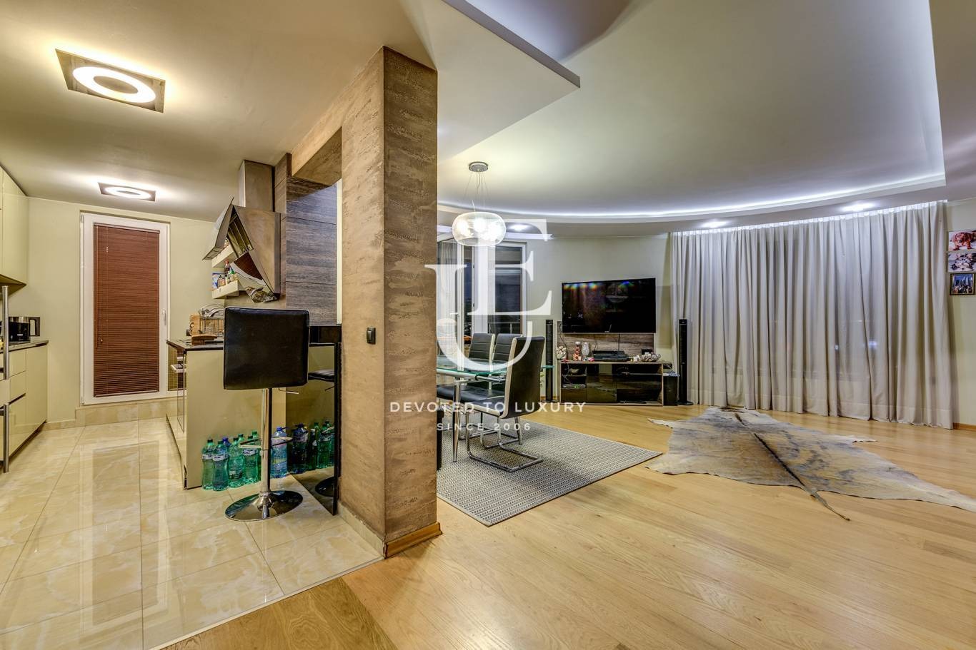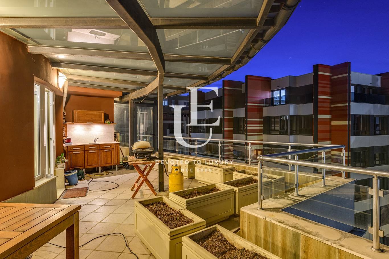 Входно антре, коридор, комфортна всекидневна с трапезария и кухня, санитарен възел, три спални със собствени бани, 2 дрешника, мокро помещение, просторна веранда, която обхваща целия апартамент - закрита част пред спалните и открита пред всекидневната с лятна кухня, BBQ и маса за хранене. Ref. ID:23835