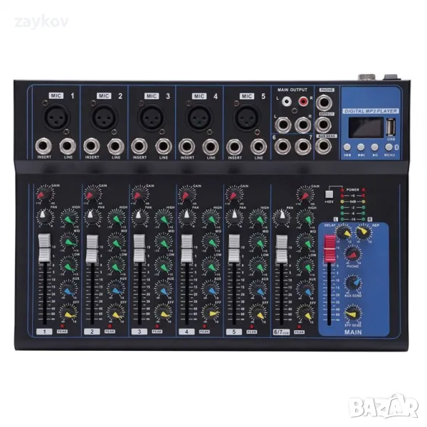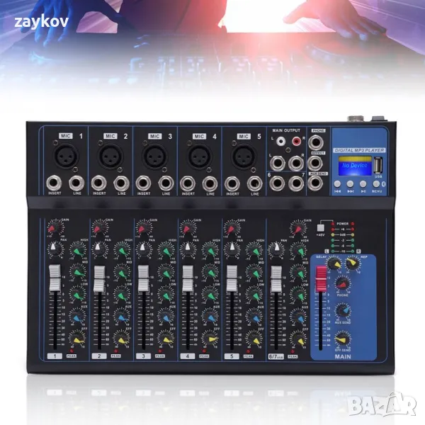 Bluetooth функция: 7-канален миксер с вграден безжичен Bluetooth модул може да поддържа безжично сдвояване на Bluetooth устройства. Това ще направи много лесно безжичното предаване на всички ваши любими песни към миксера.