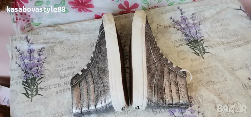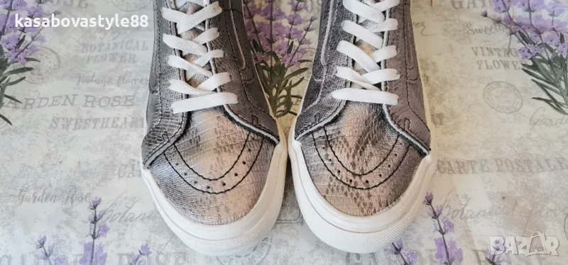 Дамски висококачествени кецове изработени от гравирана в сребрист цвят естествена кожа,включително и вътрешната част. Моделът се комбинира лесно като съчетава качество и комфорт. Обуват се с помощта на връзки. Дължина на стелка 25.3см.Ходило-3см.Цялостна височина отзад 12 см.
