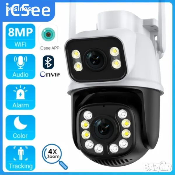 Камерата е 8MP PTZ (панорамно/наклонно/зумиращо) WiFi IP сигурностно устройство с двоен обектив, което предлага цветно нощно виждане и автоматично проследяване. Тя е съвместима с приложението ICSEE за наблюдение и управление през мобилни устройства.