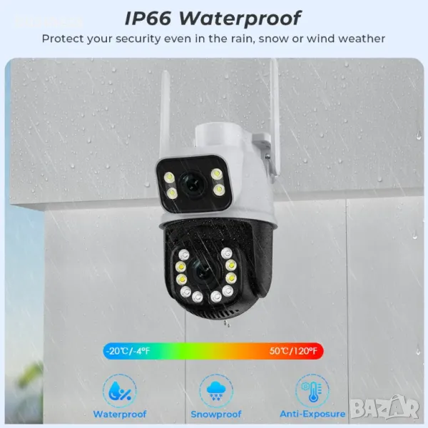 - Двойна Камера два обектива, двоен екран за преглед в приложението повече детайли, равностойна на ptz камера + камера тип bullet.