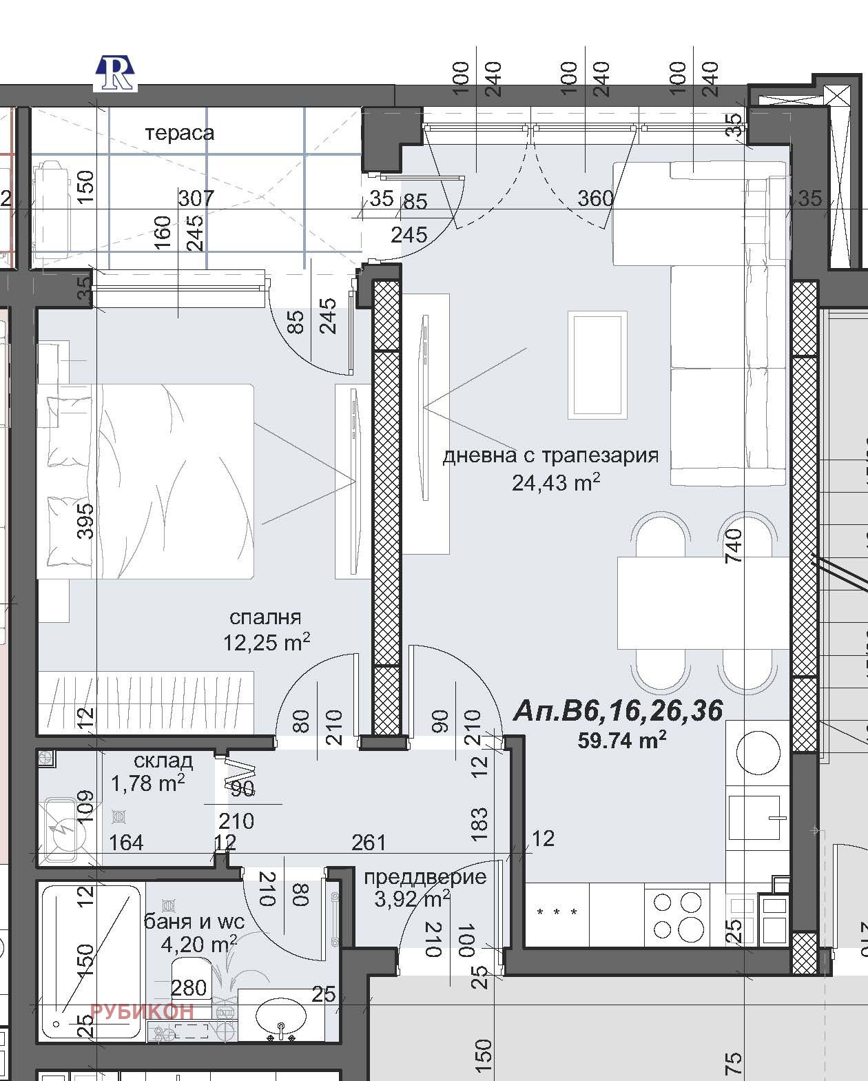 Разпределението на апартамента е както следва: просторна дневна с кухненски бокс 24.43кв.м, спалня 12.25кв.м, антре 3.92кв.м, баня с тоалетна 4.20кв.м, тераса и склад. Застроена площ 59.74кв.м. Обща площ 72кв.м. Към жилището имате възможност да закупите и паркомясто, или гараж, които се заплащат допълнително. Агенция 'Рубикон' може да ви съдейства безплатно за финансиране с кредит на вашия нов дом. За повече въпроси и информация,моля позвънете на посочения телефон. Адресът на офиса ни в Пловдив е бул. Източен 47, етаж 2, офис 7