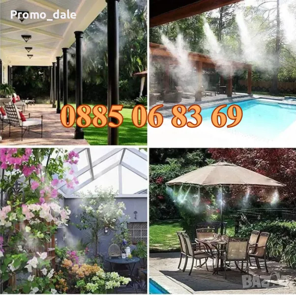Системата за охлаждане е предназначена изцяло за външна употреба. Работи на принципна на разпръскването на фина мъгла от студена вода. Това е бърз и лесен начин за намаляване на температурата на тераси, балкони, дворове, градини, външни части на заведения, барове и други. Така създадената изстудяваща завеса може да намали температурата с до 10° C. Също така е ефективен способ за борба с насекоми и мръсотия. Насекомите избягват водната мъгла, защото тя полепва по техните крила. Комплектът е подходящ за овлажняване и филтриране на въздуха, при падането си микро капките улавят мръсните частици във въздуха и ги свалят на земята. Лесен монтаж, без необходимост от употреба на инструменти.