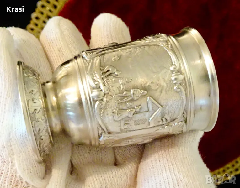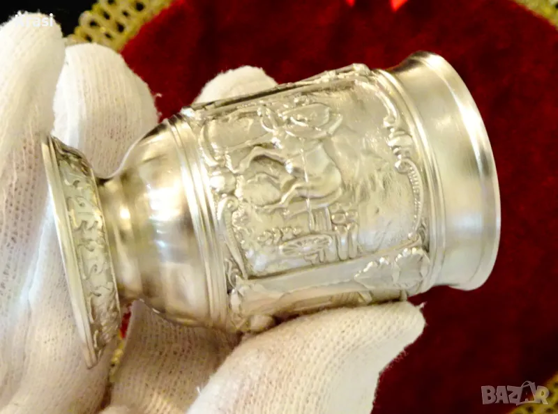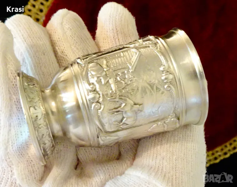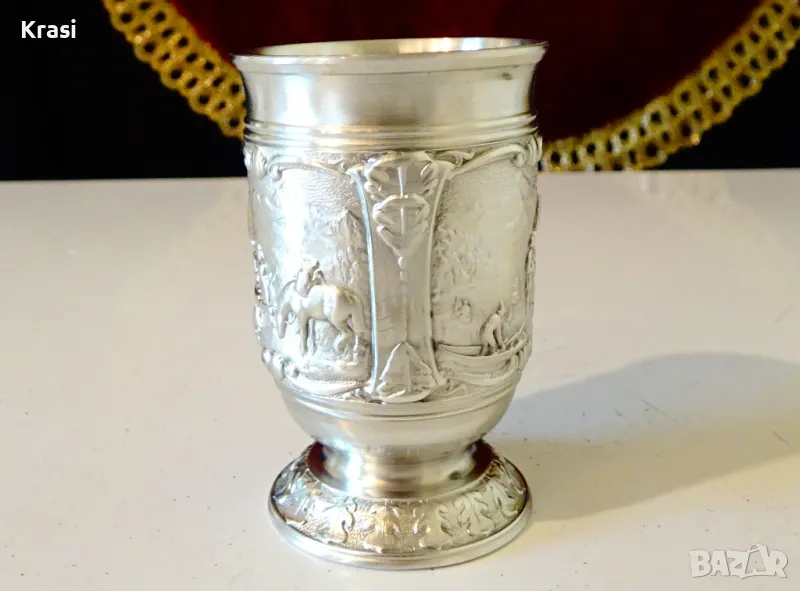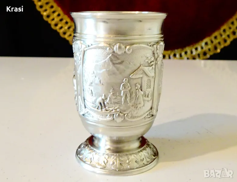 Старинна немска калаена чаша за ракия,майсторска ръчна изработка от 95% калай и 5% сребро на SkS,маркирана.Декорирана с три прецизно изваяни релефни картини от живота на село,разделени от красиви орнаменти.Височина 6 см.,диаметър 4 см.,тегло 65 гр.Вместимост 50 мл.
