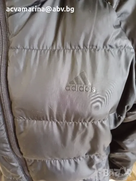 Черно ватирано оригинално дамско яке Adidas с качулка . Отлично състояние , без следи от носене . Подходящо за есен и пролет .Ширината от мищница до мищница е 102 см