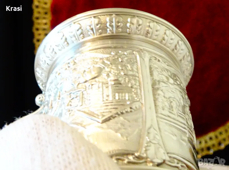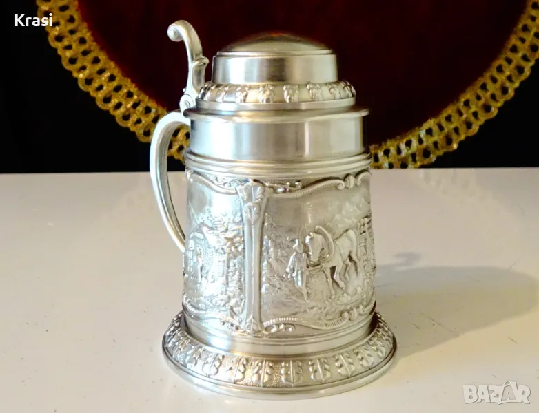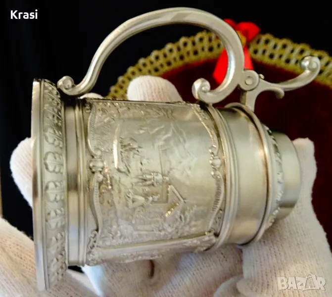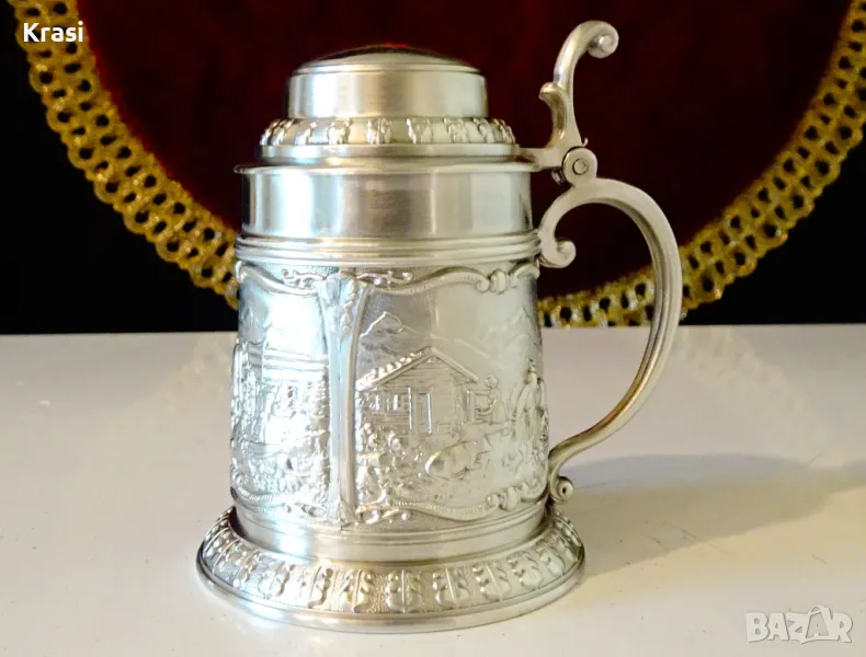 Старинна немска калаена халба,чаша за вино,майсторска ръчна изработка от 95% калай и 5% сребро на SkS,маркирана.Декорирана с три прецизно изваяни релефни картини от живота на село,разделени от красиви орнаменти.Височина 8 см.,диаметър 5.5 см.,тегло 140 гр.Вместимост 120 мл.