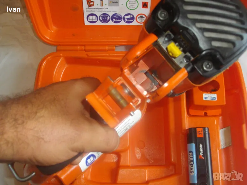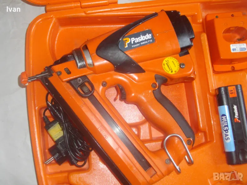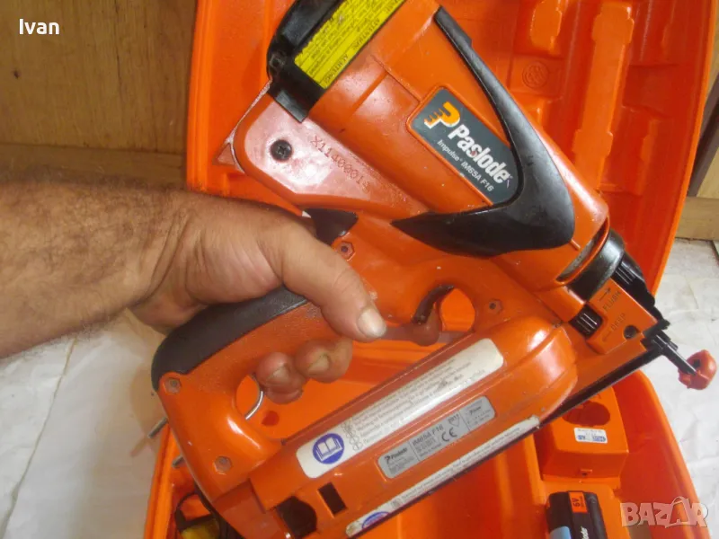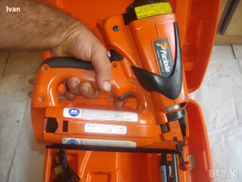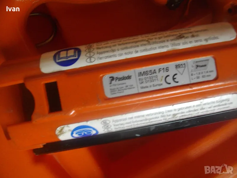 ОПИСАНИЕ на литий-йон газов такер Paslode Impulse Im 65 A F16 - а ректен монтаж на пирони игли 34 градуса размер 32-63 мм - цена 599 лв. Почти нов комплект, с много запазен външен вид иотлично механично работно състояние. За коване с ъглови 34 градуса пирони игли размер 32-63 мм. Подходящ за палети, ламперия на перо и жлеб, первази, дървени конструкции, каси на прозорци, дървени парапети на стълби. Налична 1 бр. батерия, литий-йон Li-ion 6 V, 1250 mA, 7,2 Wh, оригинално зарядно Paslode Spit, малко пирони за проба, оригинален куфар. Размери на куфара 490х450х140мм. Тегло на такера само - 2,8 кг. Тегло на всичко в комплекта с куфара - 5,5 кг. Цена- 499 лв. Този модел такер е компактна, бърза и издръжлива машина за пирони с незалепващ връх, позволяваща прецизно фиксиране. Машината разполага с LAST NAIL LOCK OUT СИСТЕМА За спиране на стрелбата на инструмента, когато е празен, предотвратявайки повреда на инструмента и повреда на строителни материали.