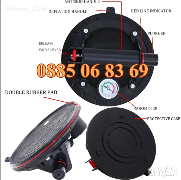Вендуза за плочки и стъкла с манометър и вакуумна помпа Ø200 мм, товароносимост до 130 кг