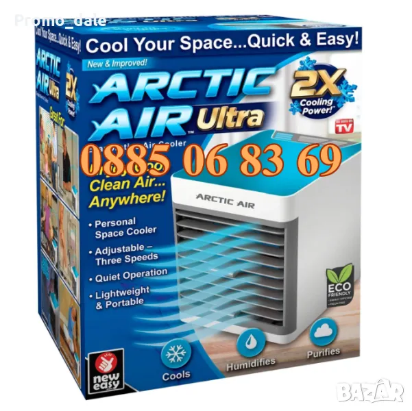 Arctic Air e персонален мини охладител. който използвайки изпарителна технология чрез специален филтър превръща студената вода в хладен, чист въздух, който ще ви отпусне и ви охлади на горещи летни дни и нощи.