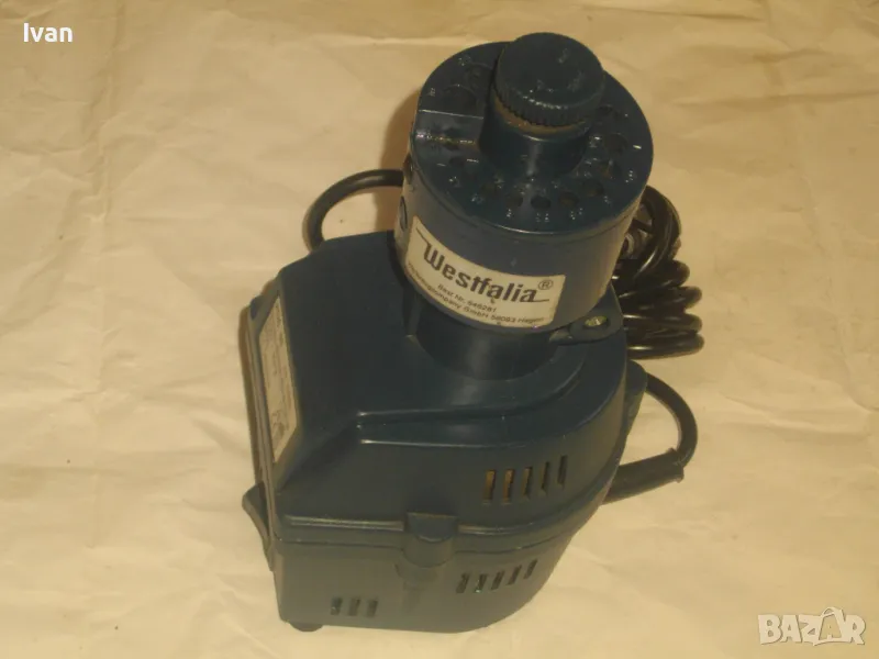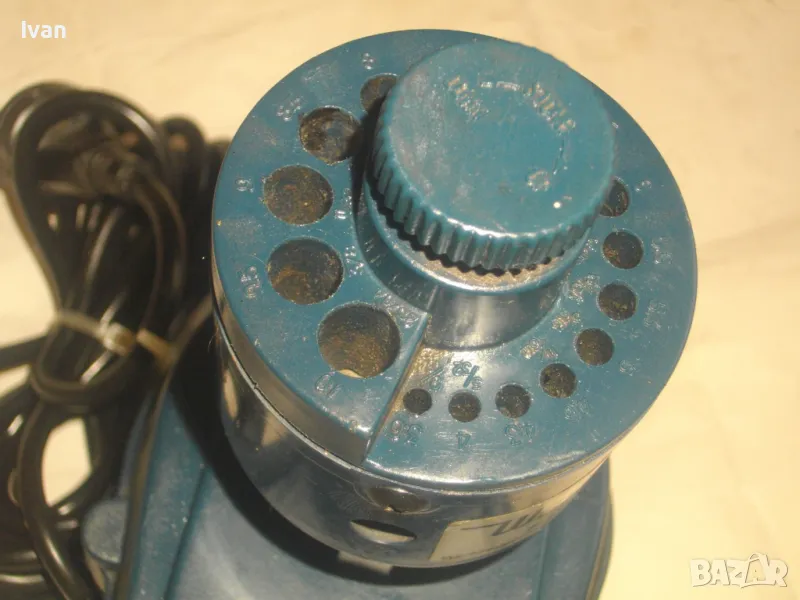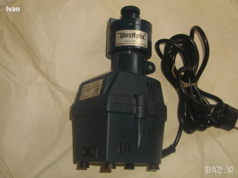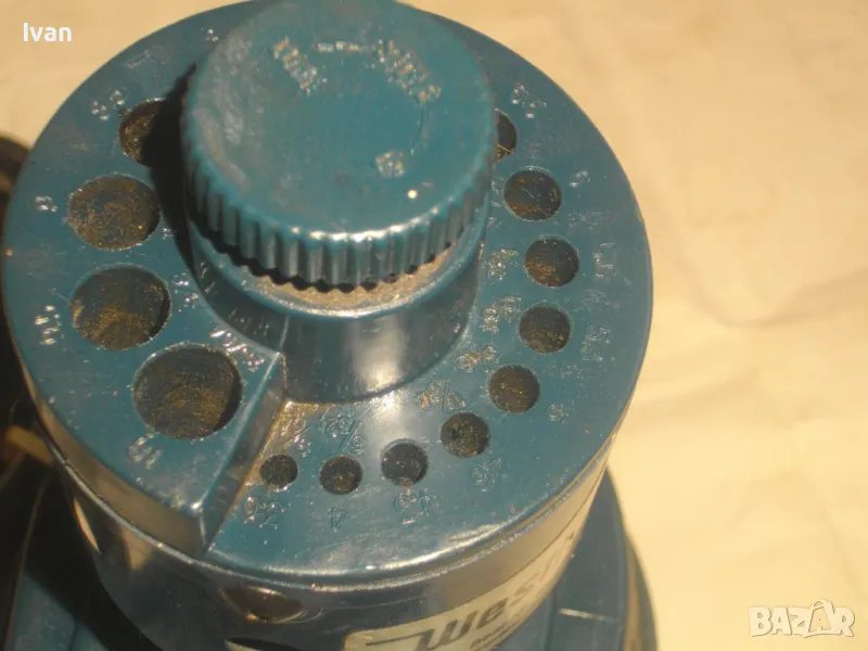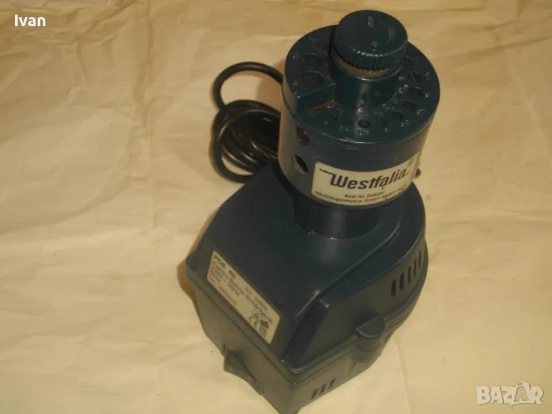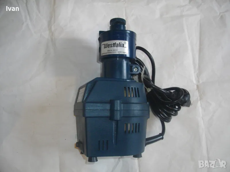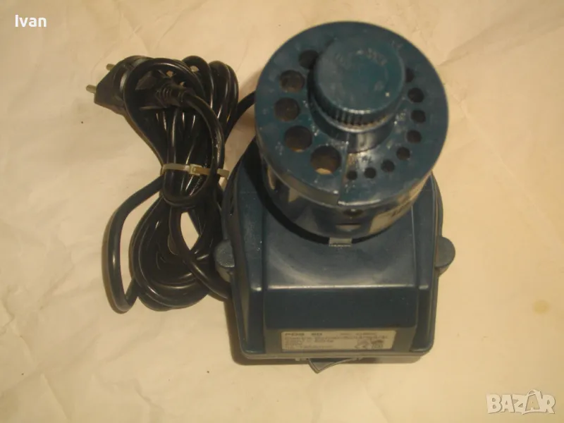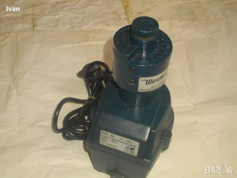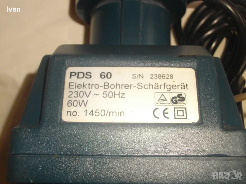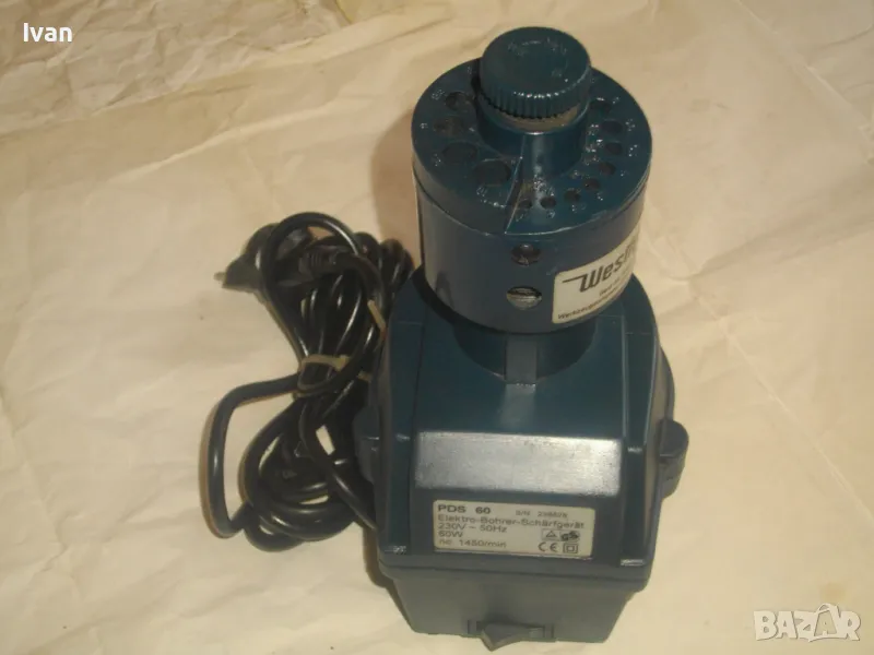 ОПИСАНИЕ на тъмно синя ел. машина точило за заточване на бургии. Немска професионална. Марка модел производство маркировки - WESTFALIA PDS 60 Electro Bohler Scharfgerat Werkzeungcompany GbmH. 230 V - 50 Hz - 1450 об/мин, 60 W. Почти нова, в отлично работно състояние. Височина 250 мм, стабилна основа, здрав стабилен самостоятелен стоеж. С камък дисков сив за заточване общо 16 бр. различни размери бургии от 3 мм до 10 мм. Регулатор на дълбочината на заточване. Тегло на точилото - 3,0 кг.