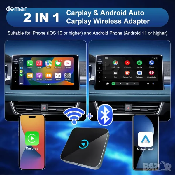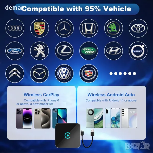 Този безжичен CarPlay адаптер преобразува кабелния CarPlay в безжично изживяване, поддържайки както iOS (iPhone 6 или по-нов, iOS 10+), така и Android Auto (Android 11+). Той разполага с бърза автоматична връзка за 5-15 секунди чрез Bluetooth 5.0 и 5.8GHz WiFi, с OTA актуализации за безпроблемна функционалност. Адаптерът запазва оригиналните контроли на автомобила, включително сензорния екран, волана и GPS, като същевременно поддържа висококачествен звук и визуализация. Неговият компактен, издръжлив дизайн с алуминиева рамка осигурява лесна преносимост и разсейване на топлината. Съвместим с повечето автомобили, включва USB-C към USB-A/USB-C кабели, с изключение на системи BMW, Tesla и Sony.