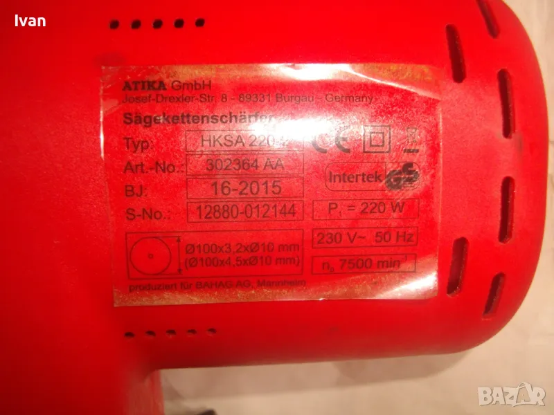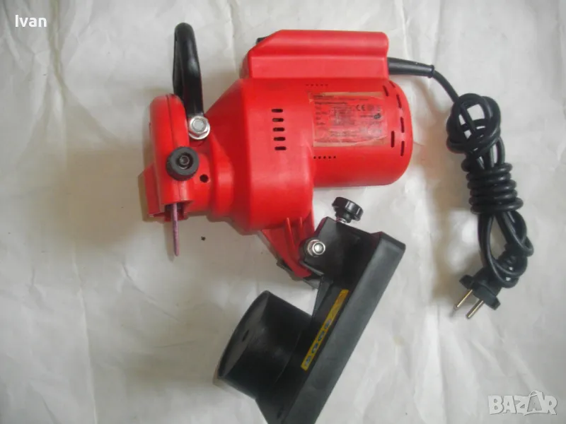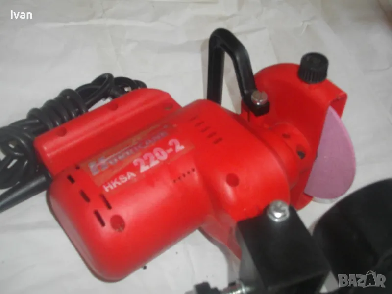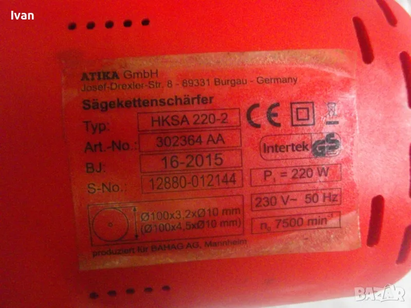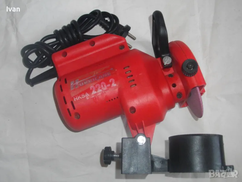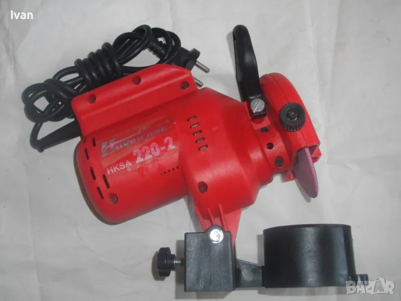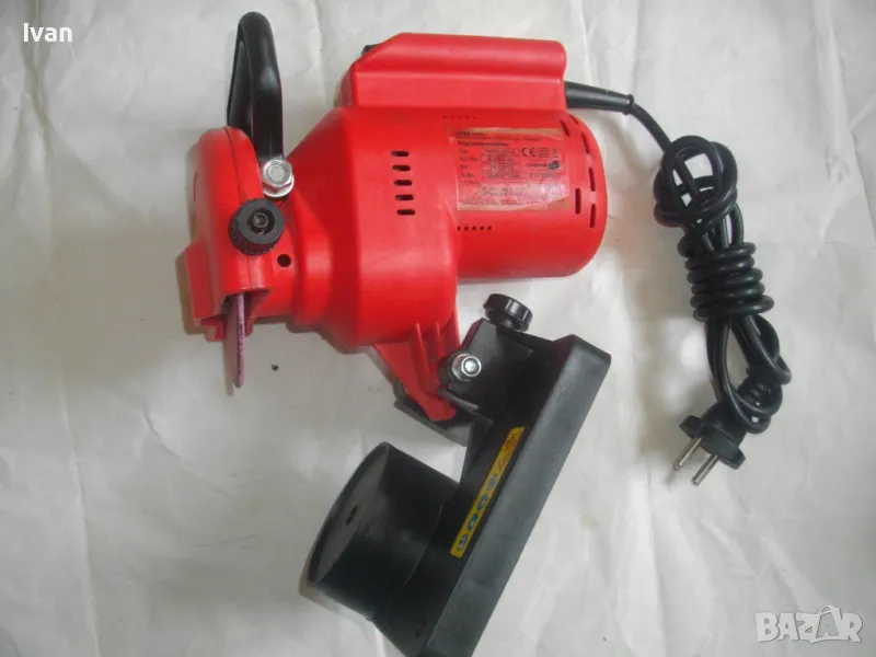 ОПИСАНИЕ на червена ел. машина за заточване на вериги - цена 99 лв. Със забележки - искрене и липса на ъгломер градуси. Марка и модел маркировки - Hurricane HKSA 220-2 ATIKA GmbH BAHAG AG Mannheim Germany. Немска оригинална професионална. Мощност 220 вата, 50 херца, 220 волта, 7500 об/мин. Камъ диск почти нов, цялата машина е почти нова визуално. Техн. състояние - има искрене и липсва ъгломер градуси заточване. Липсва и предпазител над диска. Налична горна регулираща се дръжка и налична долна основа. Тегло - 2,2 кг. Цена в описаното състояние - 99 лв.