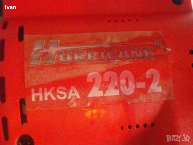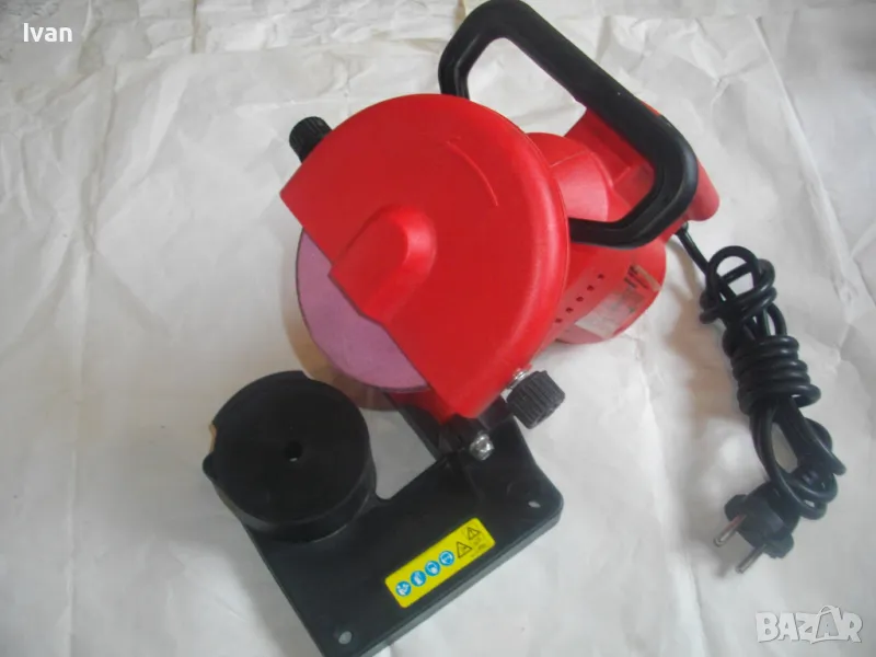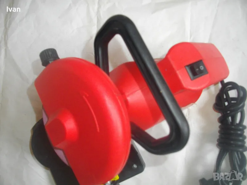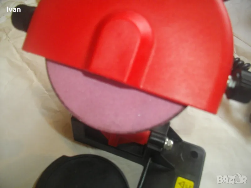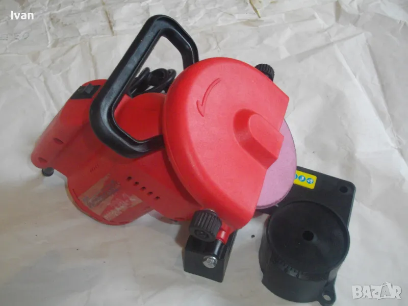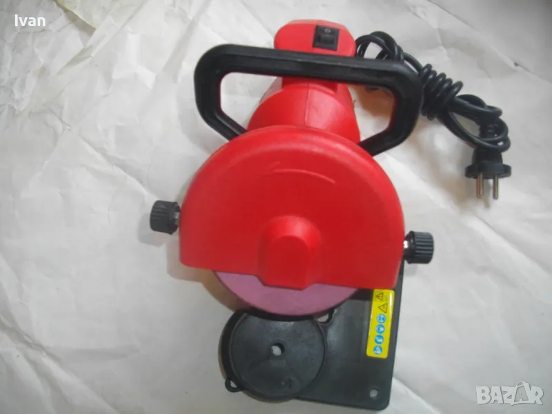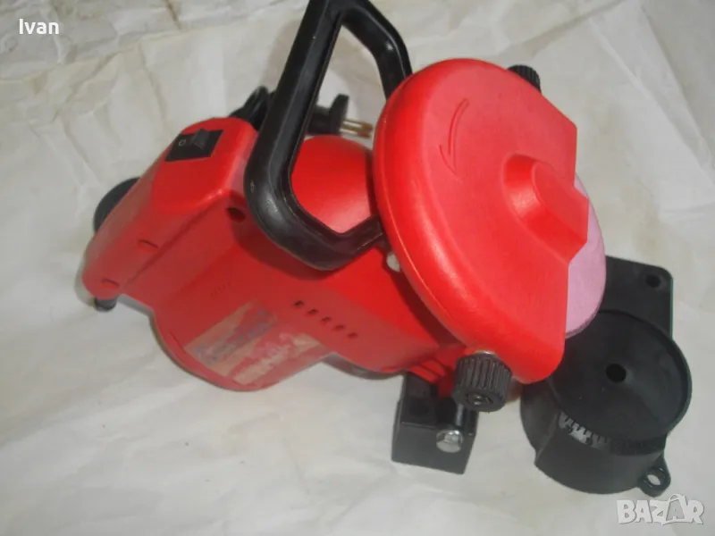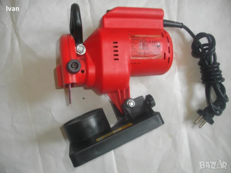 ОПИСАНИЕ на червена ел. машина за заточване на вериги - цена 99 лв. Със забележки - искрене и липса на ъгломер градуси. Марка и модел маркировки - Hurricane HKSA 220-2 ATIKA GmbH BAHAG AG Mannheim Germany. Немска оригинална професионална. Мощност 220 вата, 50 херца, 220 волта, 7500 об/мин. Камъ диск почти нов, цялата машина е почти нова визуално. Техн. състояние - има искрене и липсва ъгломер градуси заточване. Липсва и предпазител над диска. Налична горна регулираща се дръжка и налична долна основа. Тегло - 2,2 кг. Цена в описаното състояние - 99 лв.