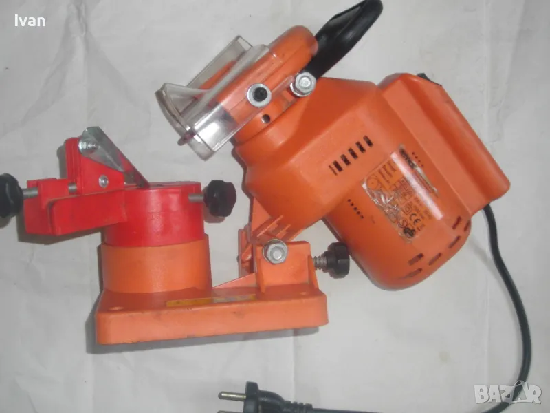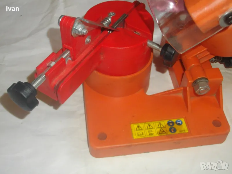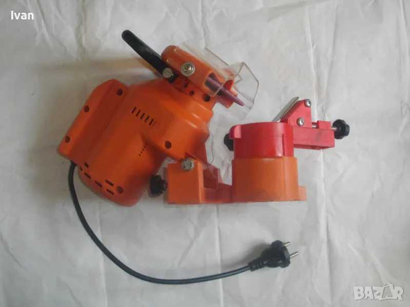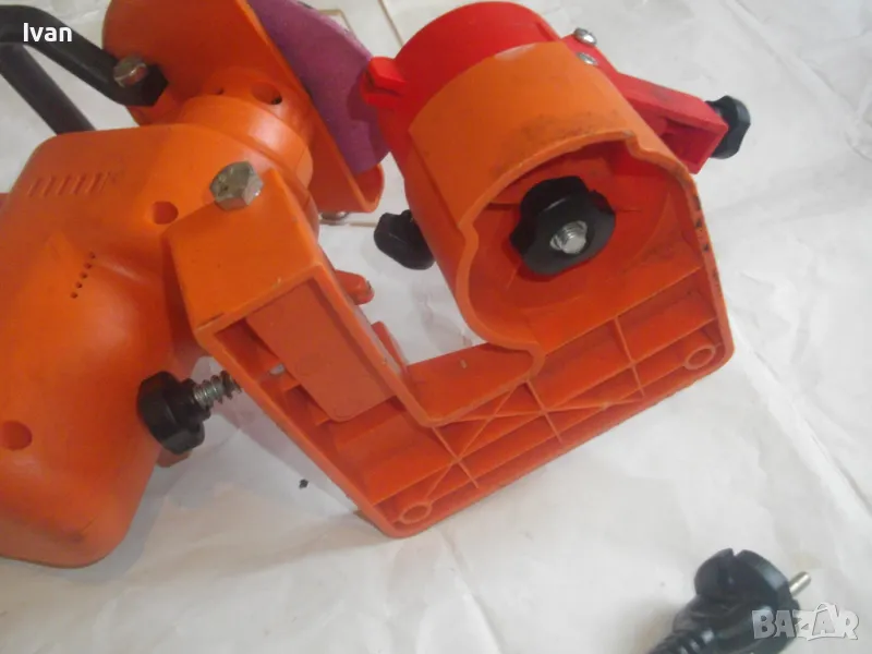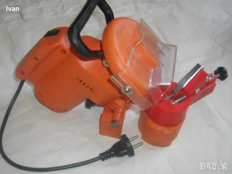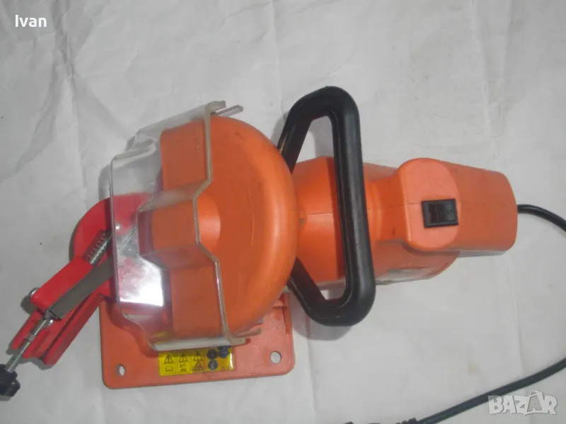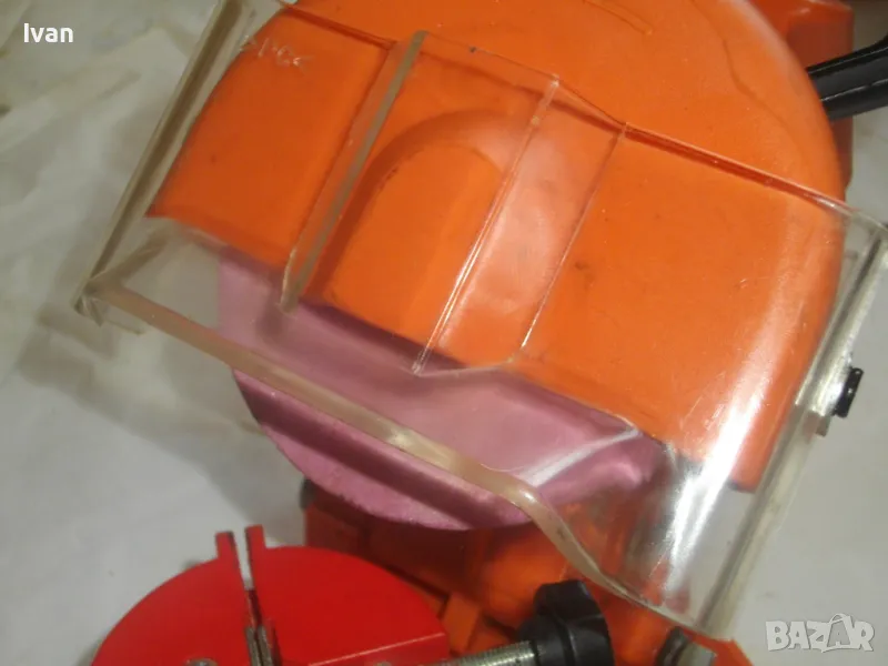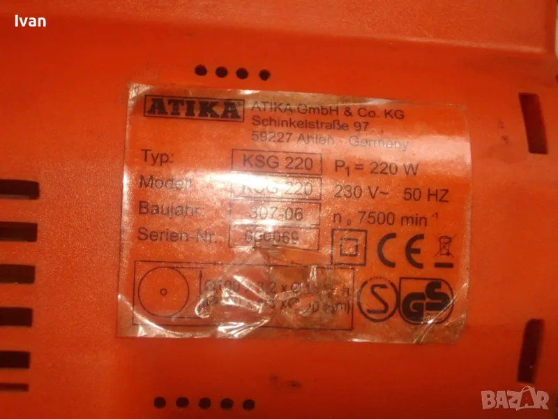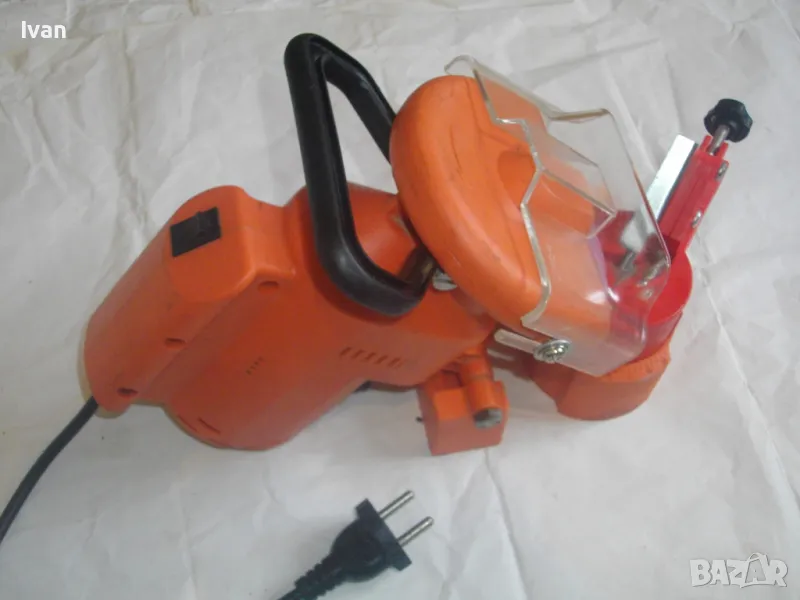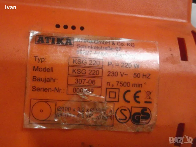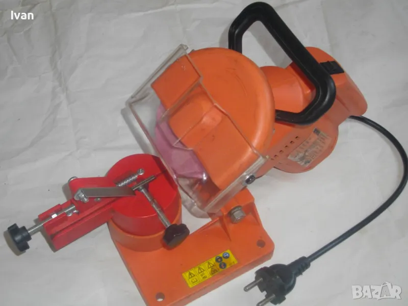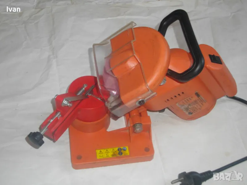 ОПИСАНИЕ на оранжева ел. машина на вериги - отлично състояние. Марка и модел ATIKA model KSG 220, производител ATIKA GmbH. Хипермощност 220 вата - 220 W, скорост 7500 об/мин. Немска оригинална професионална. Диск като нов. Регулация градуси заточване 0-30 градуса. Горна регулируема дръжка. Наклон на заточване 0-30 градуса. Предпазител над диска. Горен пусков ключ. Много запазен външен вид на машината и отлично работно техническо и механично състояние. Без никакви забележки по електрическа и механична части. Тегло - 2,2 кг.