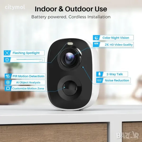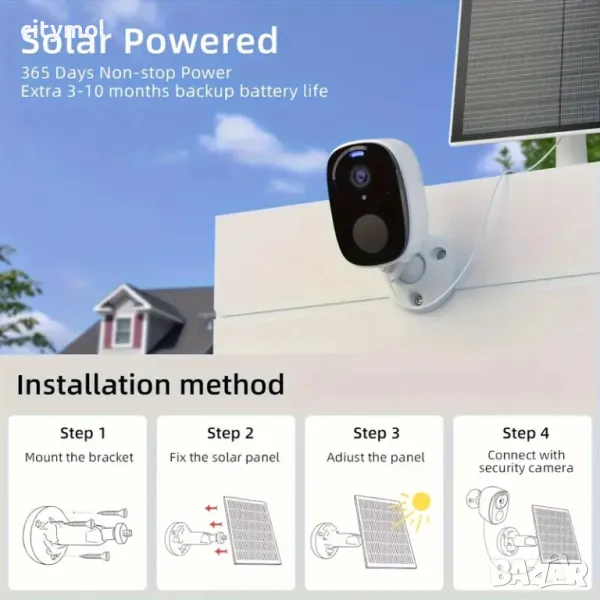 Резолюция 2K (SuperHD).Камерата има соларен панел за зареждане през светлата чаат на денонощието и вградена 5000mAh батерия, която може да се използва 90-110 дена след пълно зареждане (10 видеозаснемания на ден). С акумулаторна батерия нямате нужда от досадни кабели за вашата външна wifi камера за наблюдение. Може да ви изпраща известия, след като батерията е изтощена.