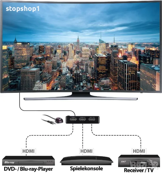 - HDMI превключвател, включително дистанционно управление, IR приемник със залепващ стикер и немски инструкции. HDMI превключвател с дистанционно – подходящ или подходящ и за: кабелен приемник, сателитен разпределител, видеорекордер, игрова конзола, DVD плейър, проектор, конвертор, суичове, ключове, сплитер, щепсел, адаптер, сплитер, лаптопи, софт, проектор, филми , камера, PS4