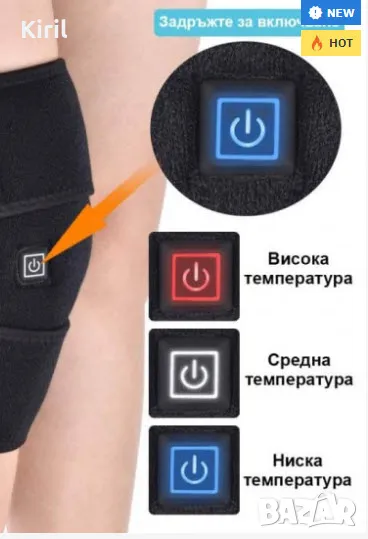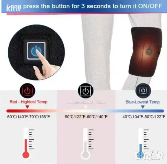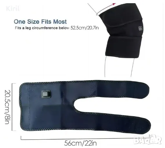ОПИСАНИЕ Един брой бързо загряваща се електрическа наколенка с три степени на затопляне: загрява за секунди, осигурява ултра удобна гореща терапия за облекчаване на болката и възстановяване на нараняванията при артрит на коляното, поддържа колената топли, може да се прилага и върху прасци, бедра, ръце за облекчаване на мускулни болки и спазми. Изключително удобна за използване. Управление с 1 бутон и 3 настройки за нагряване: много лесна за работа, можете да контролирате температурата и времето за нагряване напълно сами. Бутонът за захранване е с LED индикатор, може да се настройва на три температурни степени както следва: - червена светлина - най-висока температура - бяла светлина -средна температура - синя светлина - най-ниска температура. За да превключите между отделните температурни степени е необходимо да натиснете за кратко захранващия бутон. Електрическата наколенка е напълно регулируема и лесна за употреба: благодарение на своя дизайн с две ленти, нагревателната подложка може да се увива и да се заключва във всякакви позиции на крака или ръката, където се нуждаете от топлинен компрес. Наколенката разполага и с вградено мрежесто отделение, където при необходимост можете да поставите и торбичка с лед, като по този начин можете да използвате наколенката и за студена терапия. В комплекта е включен и 1 брой USB кабел, който може да се включи към всякакви захранвания с usb порт, като външна батерия, power bank, компютър, лаптоп, настолен компютър, зарядно за кола. Удобни за пътуване, разполагат с дълъг захранващ кабел: електрическата наколенка е компата и лесно преносима, удобна за поставяне в куфара или дамската чанта. Захранващият кабел е с дължина около 2 метра, което ще Ви позволи да се движите свободно, когато го свържете към захранване. Подходящо за поставяне около крак или ръката с обиколка под 50 см. Спецификации: Материал: Дишащ неопренов материал 3 настройки за нагряване: най-високо в червено, бяло-средно, синьо-ниско Размери: 59 * 21,8 см Включен пакет: 1 x брой електрическа наколенка 1 x USB кабел ВНИМАНИЕ!!! Наколенките не разполагат със собствена батерия, работят само включени към USB устройство на лаптоп, компютър, външна батерия и др.