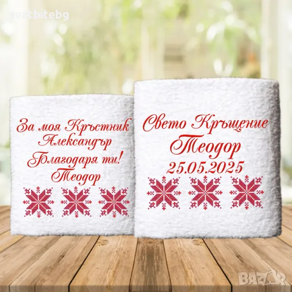 Превърнете кръщенето в незабравимо събитие и запазете спомена с нашите персонализирани бродирани хавлии за кръщене, изработени с името на детето и датата на кръщенето, придаващи уникален и личен характер.