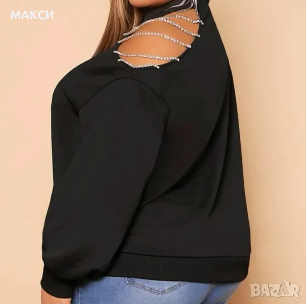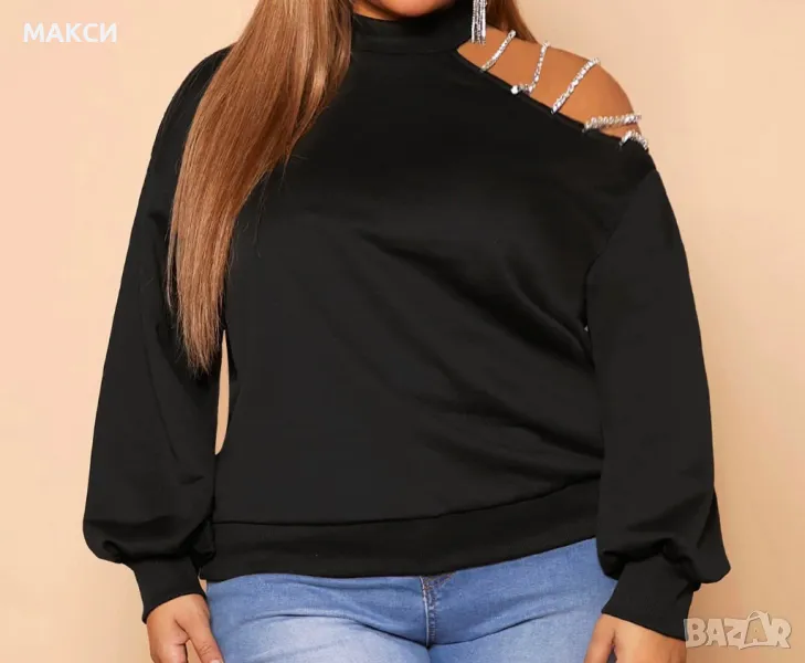 Черна макси еластична модерна блуза с голо рамо + верижки с кристали- мека, комфортна и топла