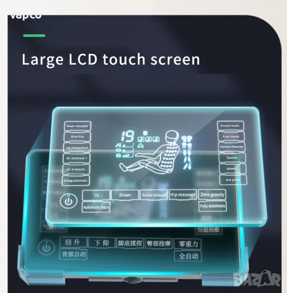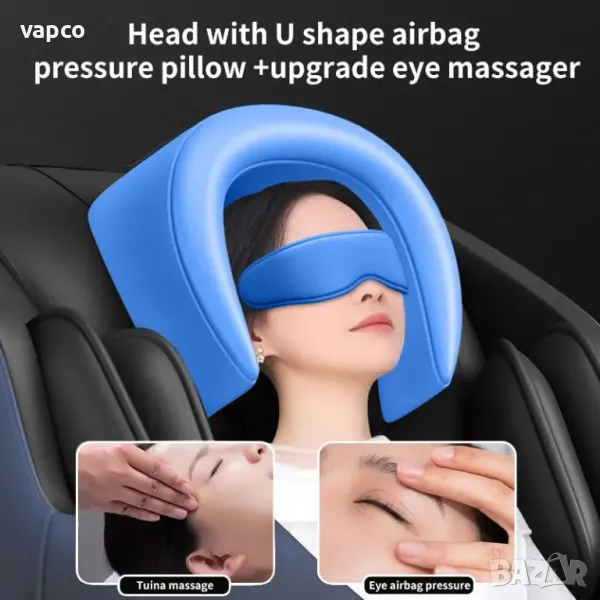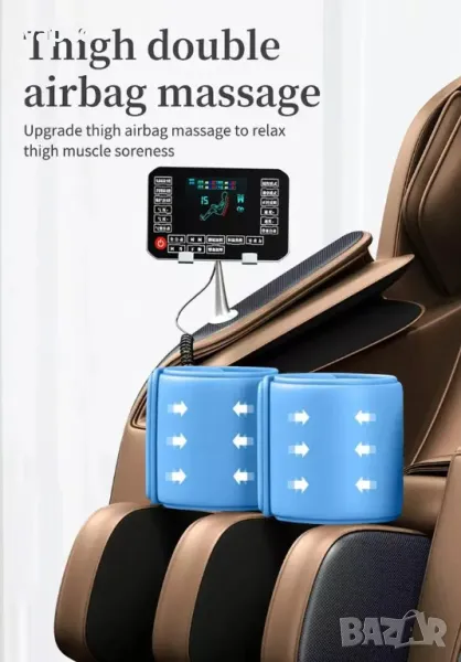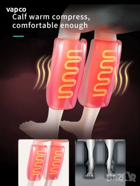 оборудван с въздушни възглавници. Може да се регулира силата на натиск и налягането. Масажът с въздушни възглавници облекчава умората, подобрява кръвообращението и ободрява тялото. Въздушните възглавници нежно масажират тялото на потребителя и стимулират естествените рефлекси на организма.