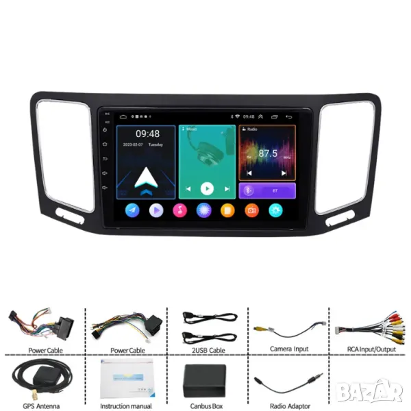 Пълен комплект с цялата рамка, преходни кабели и букси, декодери, предназначени и съвместими за монтиране на конкретния модел автомобил.