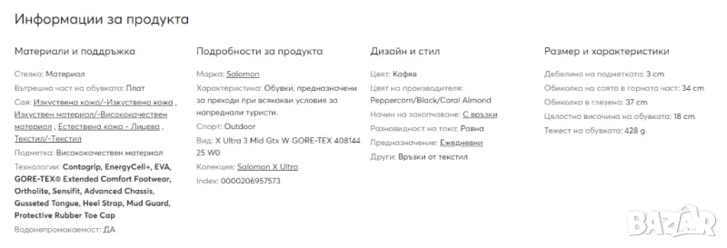 Дамските туристически обувки Salomon X ULTRA MID 3 GTX са специално проектирани така, че да изпълняват всички изисквания на жените. Тези обувки изпълняват целта си. Благодарение на технологията Descent Control са идеални за планински преходи в тежък терен, където най-много ще ги оцениш. Обуй ги и се отправи към планината със самоувереност. Те няма да те предадат дори и върху мокра настилка.