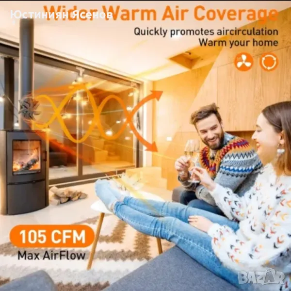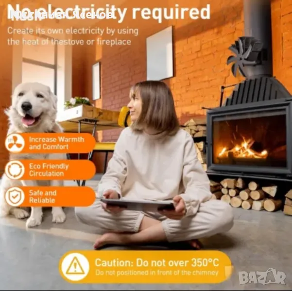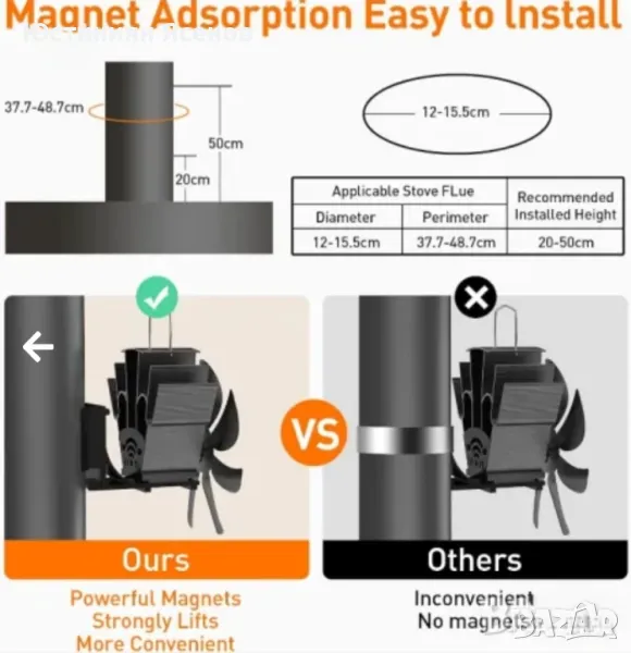 Комплекта съдържа вентилато и скоба за закрепяне към тръбата на печката/камината!