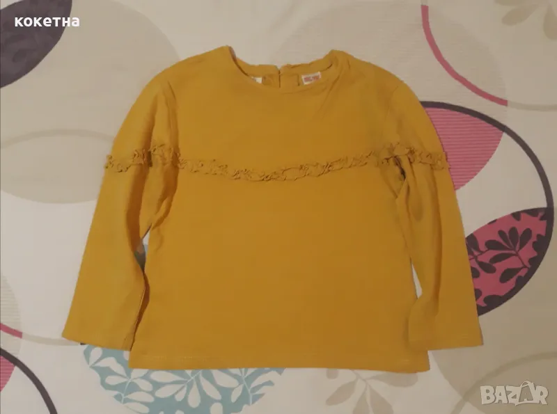 На 3 снимка блузка ZARA girls в цвят горчица. По етикет е за 3-4г р.104, дължина 39см, широчина 32см, дължина на ръкава 33см. Цена 4лв.