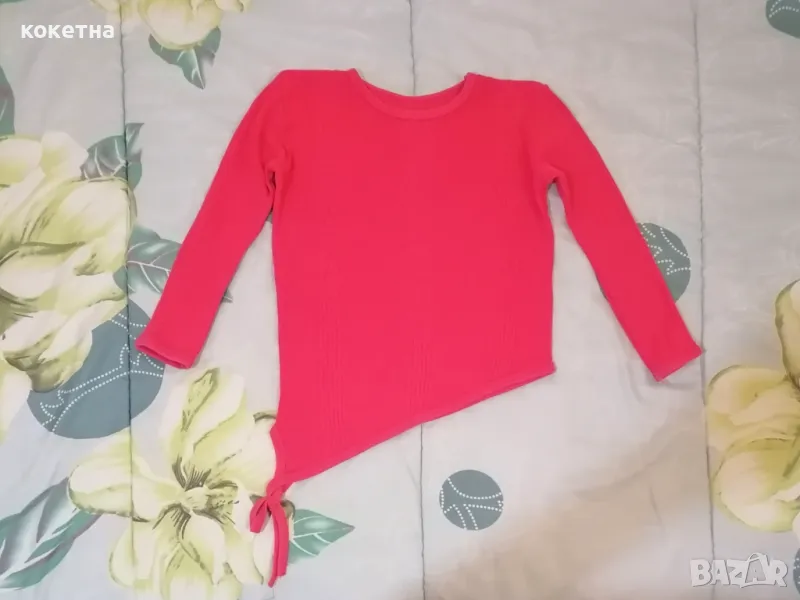 На 4 снимка цикламена блузка под наклон. Дължина 44/32см, широчина 32см, дължина на ръкава 33см. Цена 2лв.