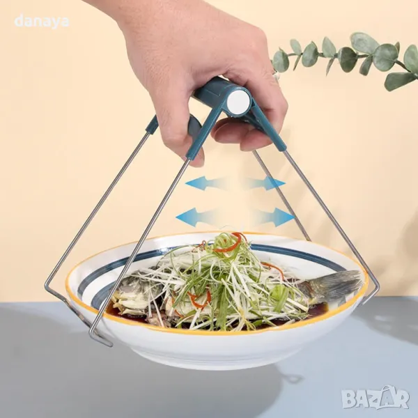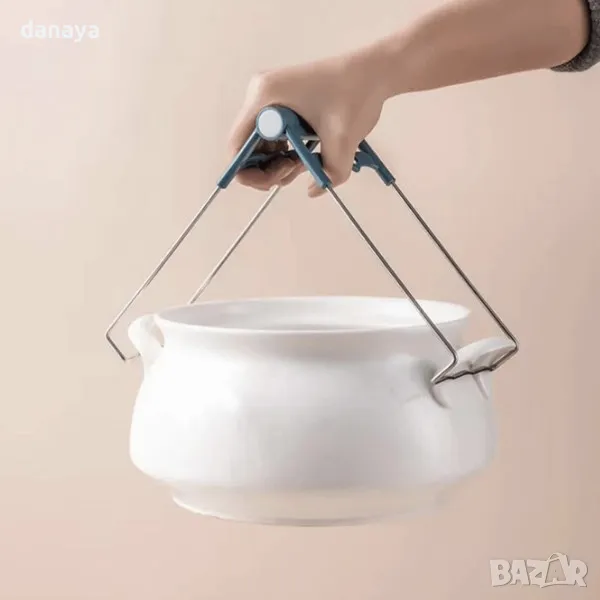 Кухненска щипка за горещи съдове. Щипка за вадене на горещи купи, тенджери, чинии, буркани и други съдове. Може да се използва също и като щипка за вадене на съд от мултикукър. Изработена от метал с пластмасова дръжка. Удобна за хващане и лесна за употреба.