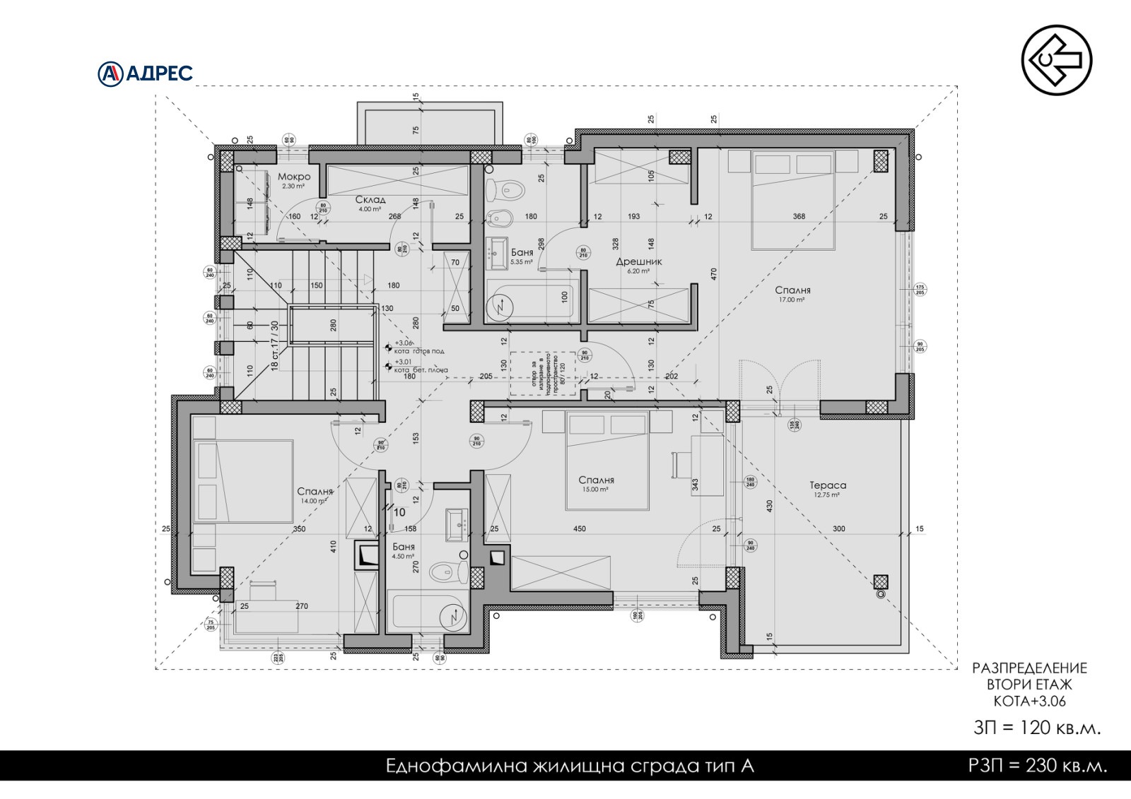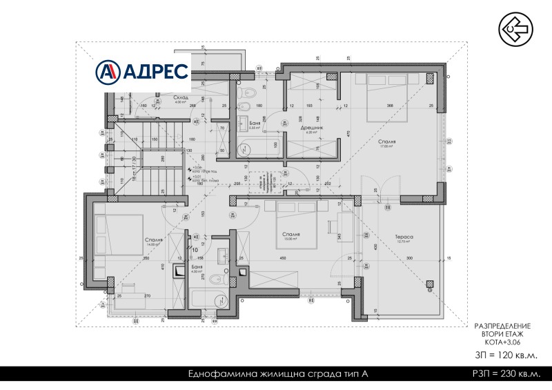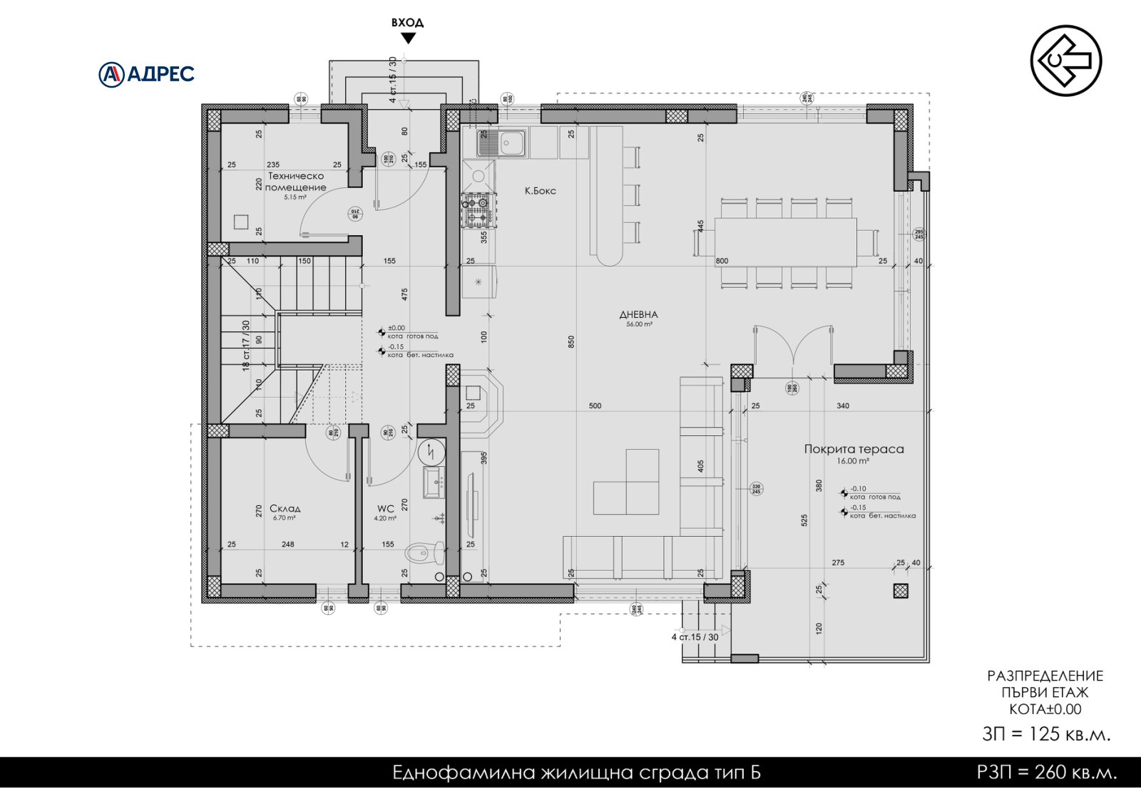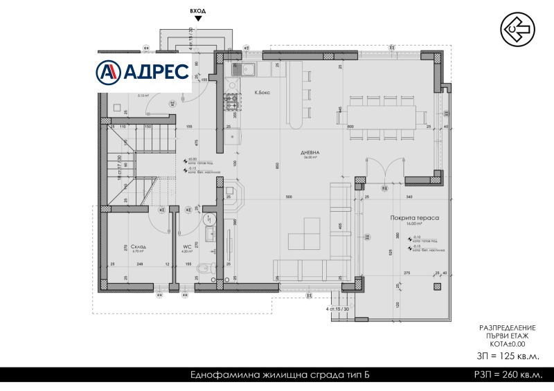 Къщата е с РЗП 260 кв м и има следното разпределение: