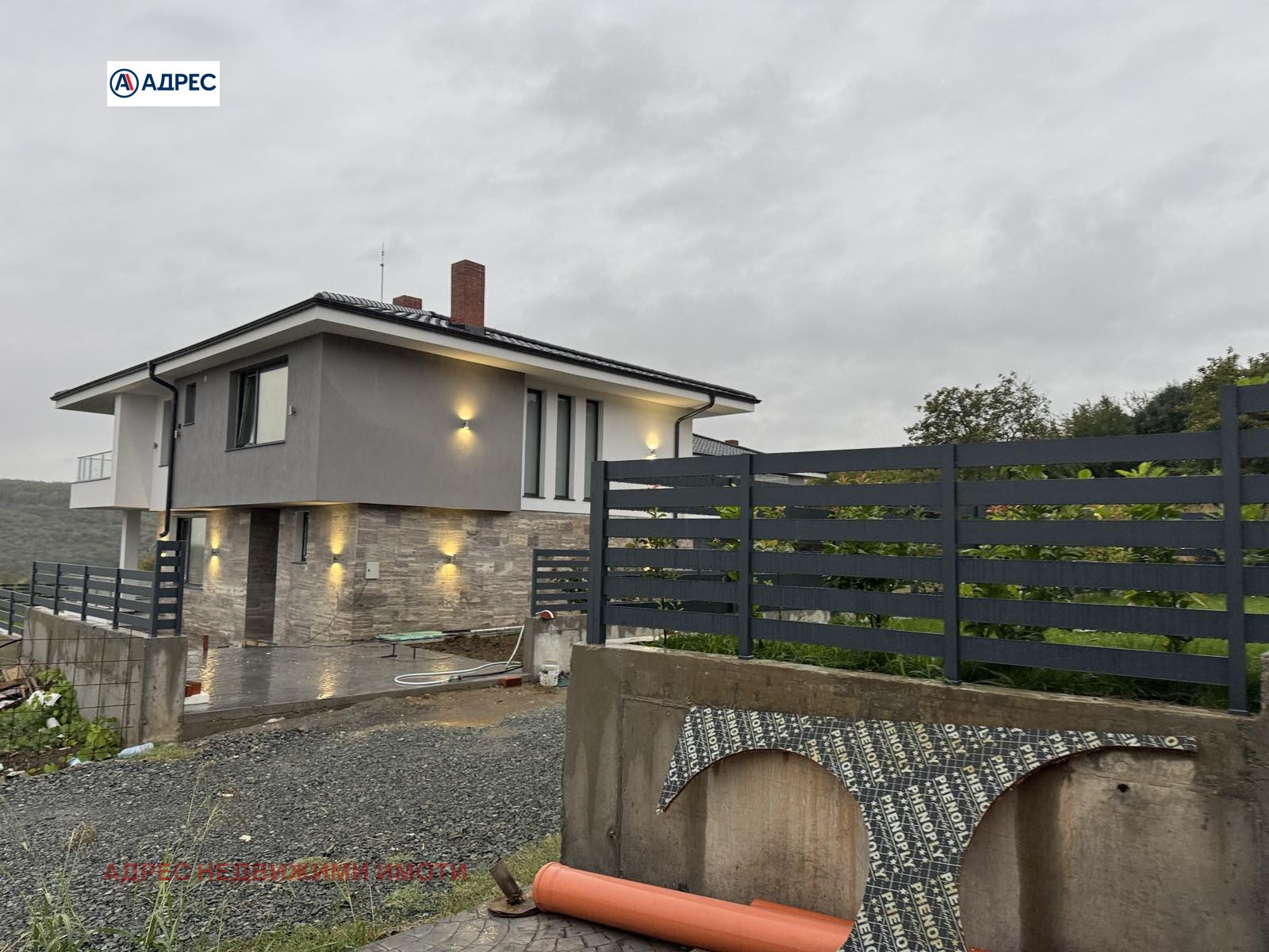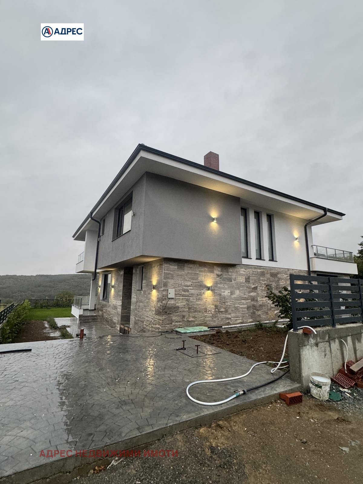 Къщата е ситуирана, съобразена и изградена спрямо дворното място, ориентирано изцяло на юг. Облицовка с естествен камък- Травертин. Вертикална планировка: