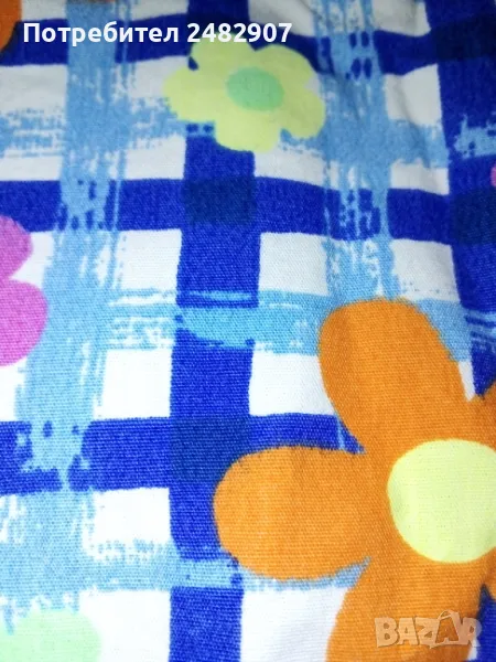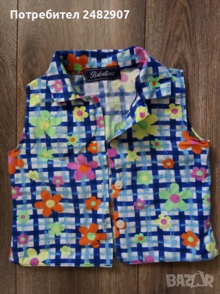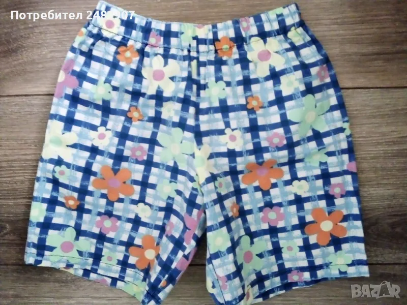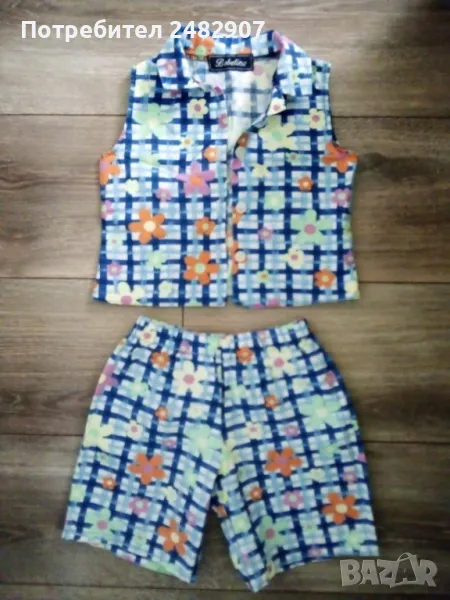 Детски цветен комплект за момиче - ризка без ръкави и къси панталонки. Ширина в раменете на ризката - 23 см, ширина под мишниците - 30 см, ширина в долната част - 31,5 см, дължина от рамото до долу - 30,5 см. Ширина на талията на панталонките - 22 см, дължина от талията до чатала - 18 см, дължина от талията до долу - 30 см, ширина на крачола в долната част - 18,5 см. Много запазен, много малко използван.