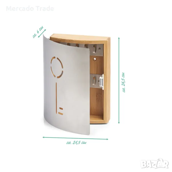 Декоративна кутия за ключове Mercado Trade, впечатлява не само със своята функционалност, но и с модерен дизайн. Тя се състои от кутия от бамбук и врата от висококачествена неръждаема стомана. Благодарение на практичният магнит, вратата може лесно да се отваря и затваря. Кутията за ключове има 8 куки за сигурно и удобно съхранение на ключове.