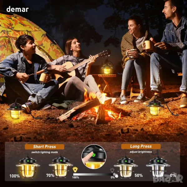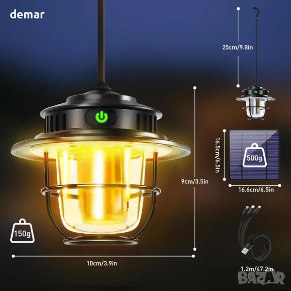 Този LED къмпинг фенер осигурява 200-1000 лумена с 360-градусово разпространение на светлината и 1300-6500K цветова температура за меко, стабилно осветление. Той предлага четири гъвкави режима с безстепенно затъмняване, за да пасне на всяка настройка. Изграден здрав и IPX4 водоустойчив, той издържа на удари, дъжд и тежки условия. Захранван от слънчева енергия, той включва 2000mAh батерия и 6000mAh соларен панел, който може да зарежда и малки устройства. С тегло само 150 грама и компактен с размери 8,9 x 9,9 см, той е изключително преносим с вградена кука за лесно окачване. Перфектен за приключения на открито, съчетаващ удобство и функционалност.
