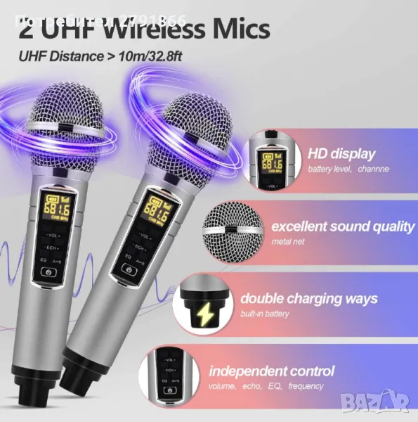 Вградена караоке машина: безжичната караоке машина съдържа 2 безжични микрофона. PA системата може да бъде свързана към всички устройства като мобилни телефони и персонални компютри чрез Bluetooth. Поддържа U, TF и OFF порт за карти, можете да свържете караоке аудио към вашия телевизор и да създадете свое собствено домашно кино.