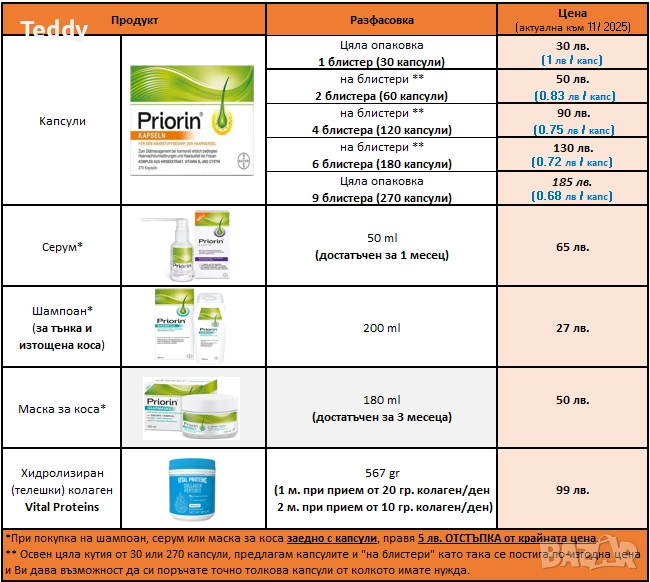 🎁 Получавате 3 EUR отстъпка при покупка на 2 или повече продукта Priorin и обща стойност на поръчката над 50 EUR. Включени са всички продукти от гамата – капсули, серум, маска и шампоан. Вижте цените им в една от прикачените снимки.
