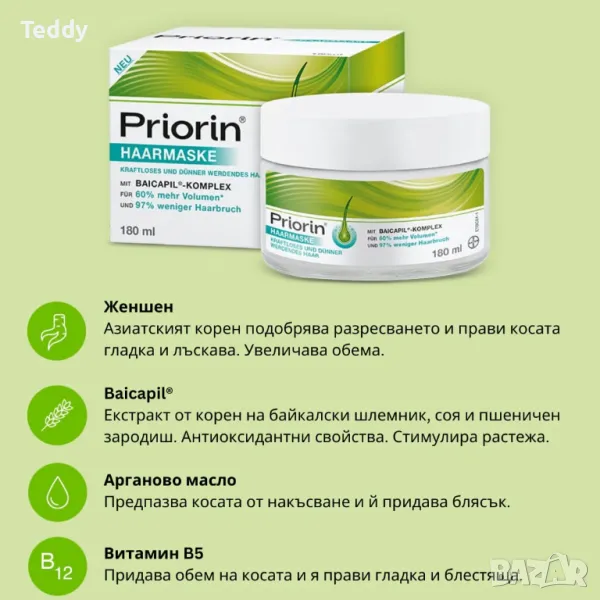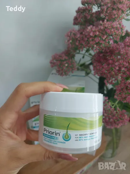- Маската за коса Priorin е оптимално адаптирана към нуждите на слабата и изтъняла коса и придава 75 процента повече блясък и 60 процента повече обем (спрямо преди измиване)