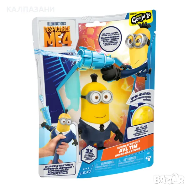 Пренеси забавлението на Despicable Me 4 у дома по изцяло нов лигав начин! Миньоните вече се превърнаха в супер лигави, разтегливи екшън фигури! Феновете могат да играят с AVL Tim от Despicable Me 4. Той има уникален пълнеж с водни мъниста, благодарение на който можеш да разтягаш и стискаш мекото му тяло и да видиш как главата и тялото му се разширяват! Той се разтяга до три пъти първоначалния си размер. Най-хубавото е, че винаги ще се върне към първоначалната си форма! AVL Tim включва и воден бластер, който може да държи в ръката си! Напълни бластера с вода и да го накарай да пръска. Фигурката AVL Tim от Despicable Me 4 е лигав начин за игра без бъркотия.