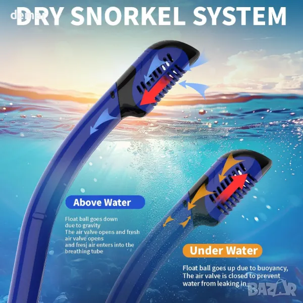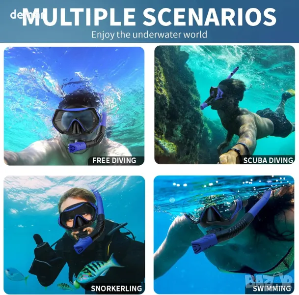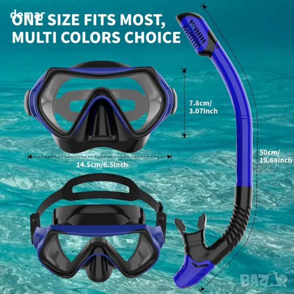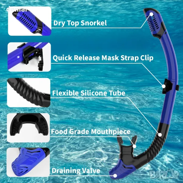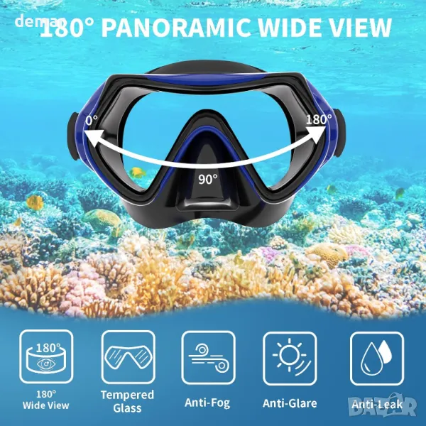 Маската за гмуркане предлага 180° панорамен изглед с прозрачни плоски лещи, предлагащи ясна подводна видимост без изкривяване или дискомфорт. Проектиран за професионална употреба, той включва стабилен сух плаващ клапан за предотвратяване на течове, а лещите от закалено стъкло имат обработка против замъгляване, за да блокират UV лъчите. Изработена от мек, хранителен силикон, маската осигурява комфорт и е хипоалергенна, което я прави лесна за почистване при продължителна употреба. С регулируема презрамка пасва на различни форми на лицето и е лек, идеален за свободно плуване и гмуркане.