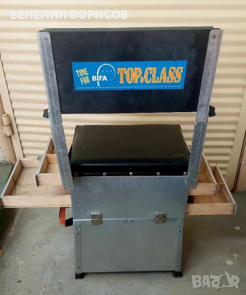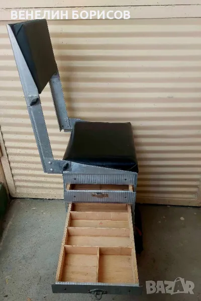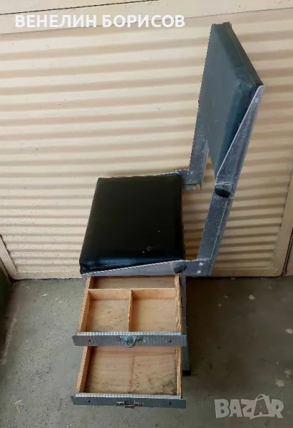 Рибарско столче с четри чекмеджета за различни рибарски такъми.