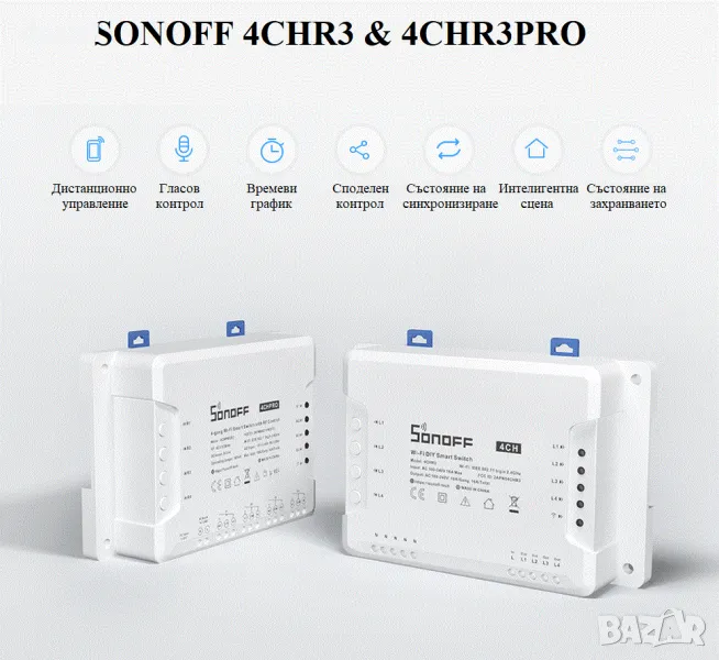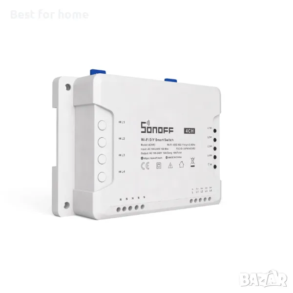 SONOFF 4CHR3 е 4-канален Wi-Fi интелигентен превключвател, предназначен да Ви даде възможността да интегрирате интелигентно управление във Вашия дом, за да създадете интелигентен дом. Всеки интелигентен превключвател има 4 групи, които могат да се използват за управление на осветлението и други домашни уреди едновременно в четири зони на Вашия дом. Има голяма разлика между 4CHR3 и 4CHPROR3, която е, че 4CHPROR3 е проектиран с допълнителна функция за RF контрол. Функцията е нарочно приета, за да Ви накара да включвате/изключвате устройството, свързано с 4CHPROR3 чрез дистанционното управление RM433. Новото подобрение на 4CHR3 и 4CHPROR3 в сравнение с 4CHPR2 и 4CHPROR2 е потребителите да задават тези 3 режима на работа в приложението “eWeLink” вместо в самия хардуер, по-лесно за работа. Така че можете да активирате режим на самозаключване, за да включите/изключите 4 свързани устройства поотделно, режим на блокиране, за да включите 1 свързано устройство всеки път и да изключите останалите устройства едновременно, и инчиращ режим, за да включите 1 свързано устройство и след това да го накарате да се включи изключва се автоматично след определено време (0,5 – 3600s). За устройството далеч от превключвателя можете да създадете подвижно пространство чрез DIN шина, за да ги свържете. Просто активирайте устройства чрез гласа си, когато превключвателят работи с Alexa и Google Home.