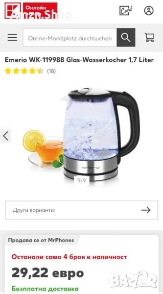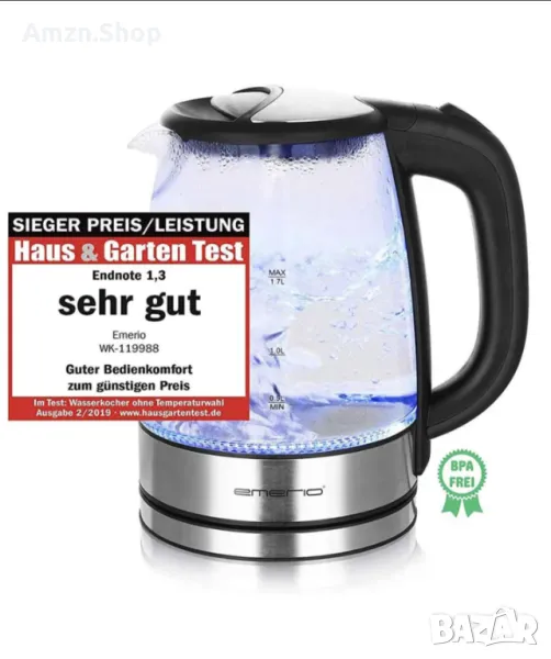 Стъклена електрическа кана Чайник Emerio 1.7L безжичен без BPA → Обява 47444096